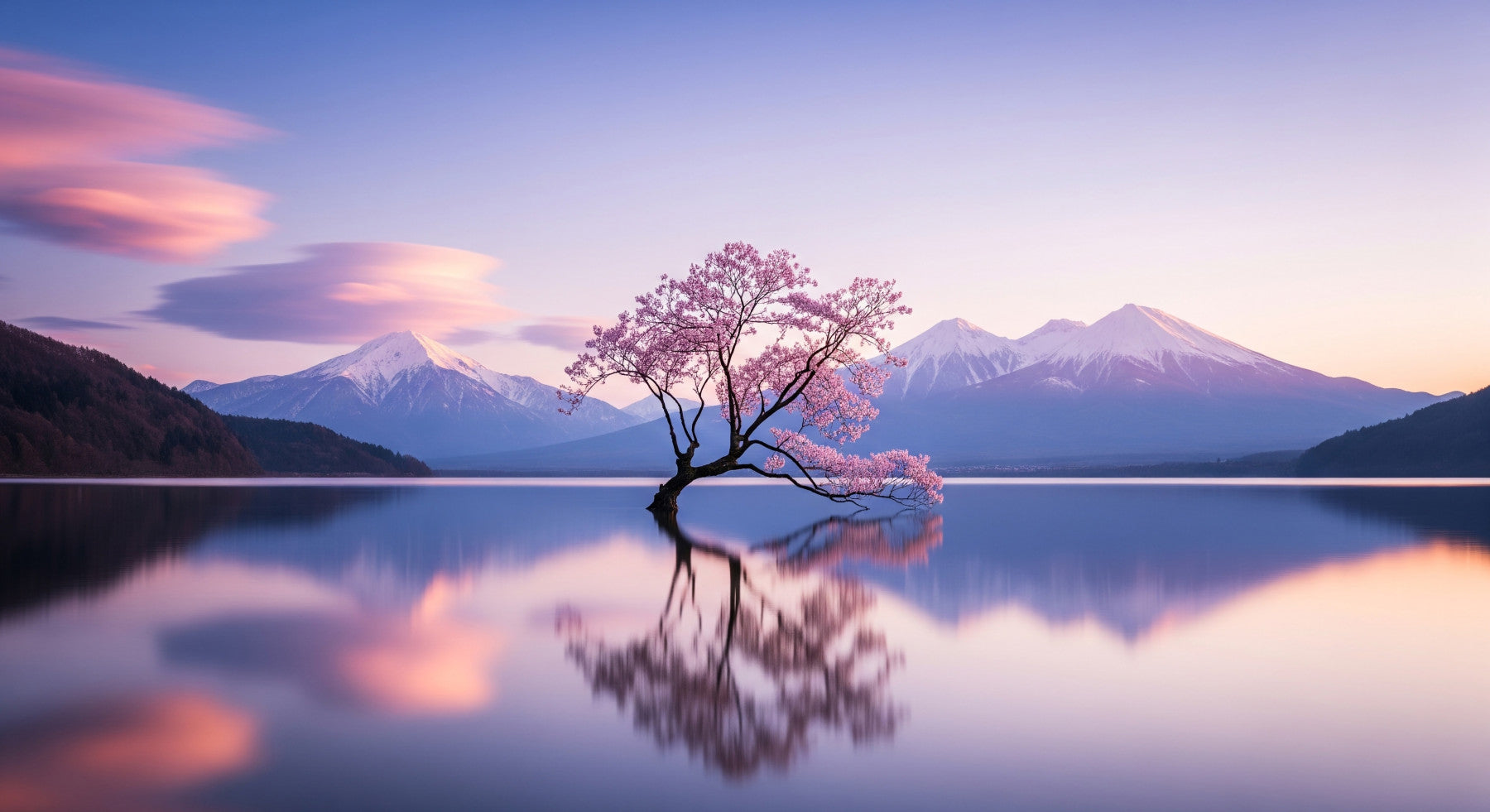 Immerse yourself in the serene beauty of Blossom Mirror Tranquil Mountain Reflection." This exquisite wallpaper captures a breathtaking landscape where the majestic, snow-capped mountains meet a perfectly still lake, creating a flawless mirrored image. A solitary cherry blossom tree, adorned with delicate pink blossoms, stands gracefully within the lake, its reflection mirroring its ethereal beauty. The soft pastel hues of the dawn sky, blending from gentle pinks to calming blues, cast a tranquil glow across the entire scene. This image evokes a sense of peace, harmony, and reflection, making it a perfect backdrop to inspire calm and focus. Allow this stunning vista to transform your digital space into a sanctuary of tranquility, offering a daily escape to a world of natural beauty and serene contemplation. Elevate your screen with this tranquil masterpiece, and let the gentle beauty of nature enrich your everyday life.