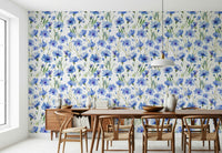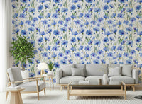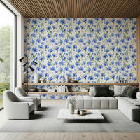 Embrace the calm elegance of this floral watercolor pattern by Uta Naumann. It showcases delicate cornflowers in shades of blue, gently painted with soft green foliage. This wallpaper for walls brings a touch of countryside charm and creates a serene ambiance. The design lends itself well to bedrooms, living rooms, or any space where a peaceful retreat is desired. The light and airy style enhances natural light, making rooms feel more spacious. It pairs effortlessly with both modern and classic furniture, creating a harmonious blend that's always in style.