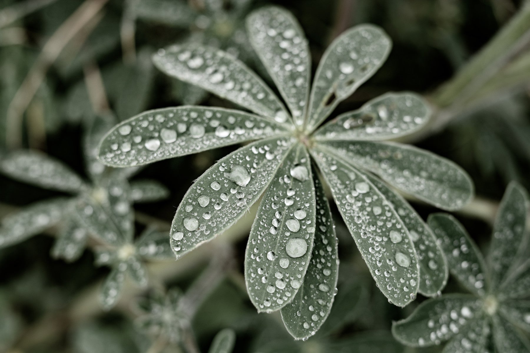 Immerse yourself in the serene beauty of Blue Lupine #4 a captivating wallpaper that showcases the intricate details of nature's artistry. This image focuses on the lupine leaves, transformed into a spectacle of light and texture by a generous scattering of glistening water droplets. Each droplet acts as a miniature lens, reflecting the surrounding environment and creating a mesmerizing dance of light. The soft color palette evokes a sense of tranquility and peace, ideal for creating a calming atmosphere on your device. The subtle hues and macro perspective invite you to appreciate the delicate balance and quiet beauty found within the natural world. Perfect for those seeking a touch of organic elegance and a moment of serene contemplation in their daily digital lives, "Blue Lupine #4" will bring a refreshing and revitalizing essence of the outdoors to your screen.