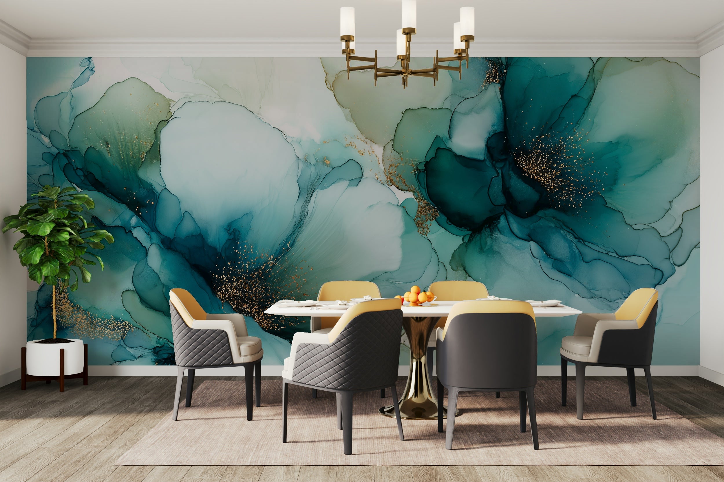 Enhance your living space with Blue Mist Ink Flowers wallpaper. The design features flowing, abstract floral patterns with teal and aqua tones, enhanced with shimmering gold accents. The artistic touch gives a luxurious effect. This wallpaper for walls brings an element of nature into your home. Perfect for a sophisticated bedroom, a serene bathroom, or an inviting entryway. The unique design seamlessly blends with various interior styles.