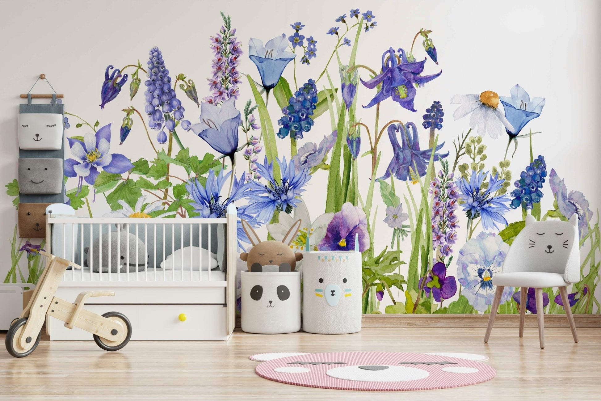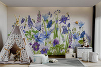 Invite nature indoors with this beautiful wallpaper by Uta Naumann for walls. Featuring a delicate watercolor design of wildflowers in shades of blue, purple, and white, interspersed with lush green foliage, this wallpaper brings a touch of the countryside to your home. The artistic brushstrokes and soft hues create a calming atmosphere perfect for bedrooms, living rooms, or even a cozy reading nook. The design easily complements a range of interior styles, from farmhouse to modern.