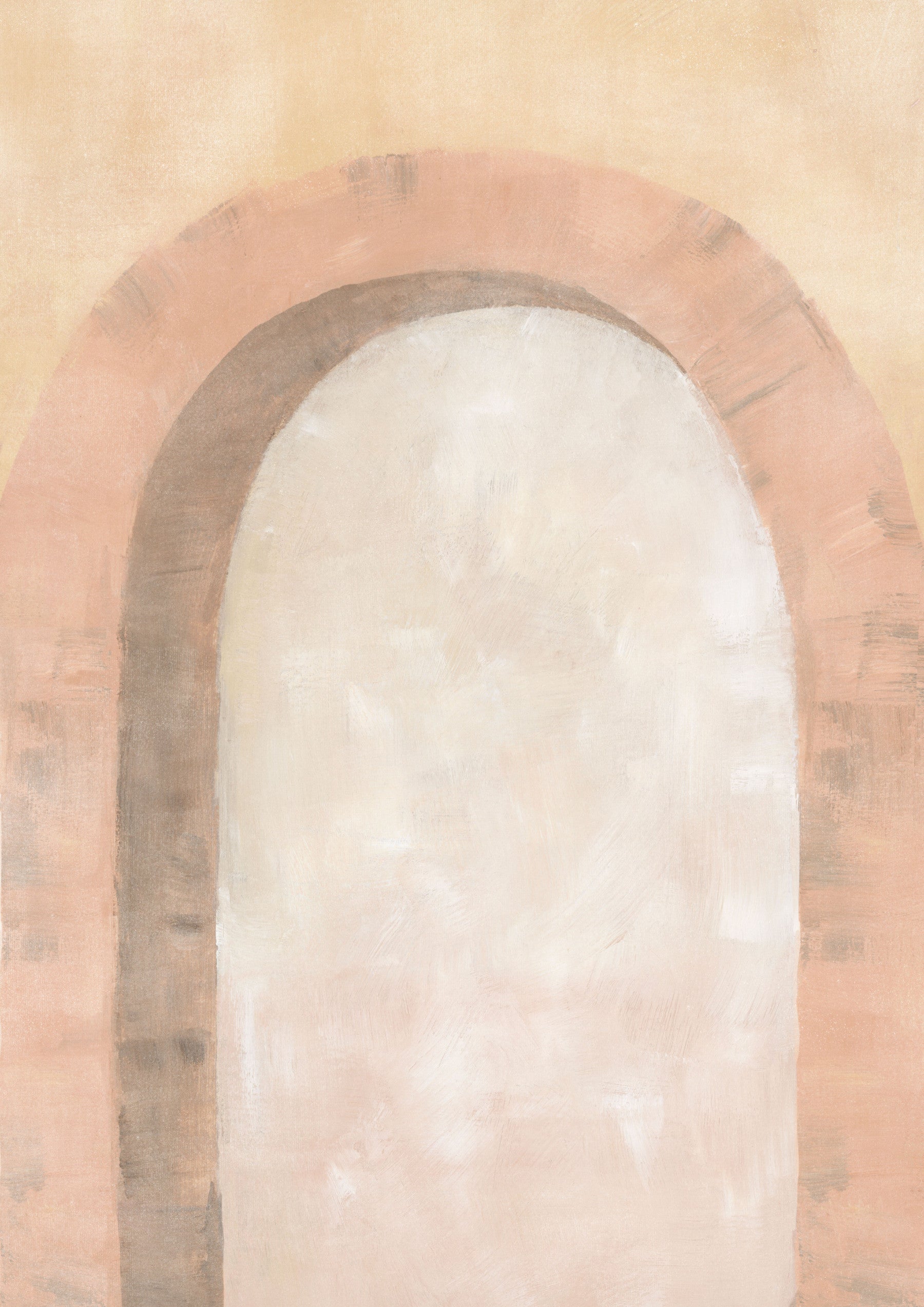 This wallpaper features a minimalist abstract painting of an archway rendered in soft, muted tones of blush pink, beige, and taupe. The textured brushstrokes create a sense of depth and warmth, evoking feelings of serenity and calm. The simple yet elegant design lends itself well to various interior styles, bringing a touch of sophistication and understated beauty to any room. The neutral color palette makes it a versatile choice for bedrooms, living rooms, or hallways. The image has a soothing and peaceful atmosphere, perfect for creating a relaxing environment.
