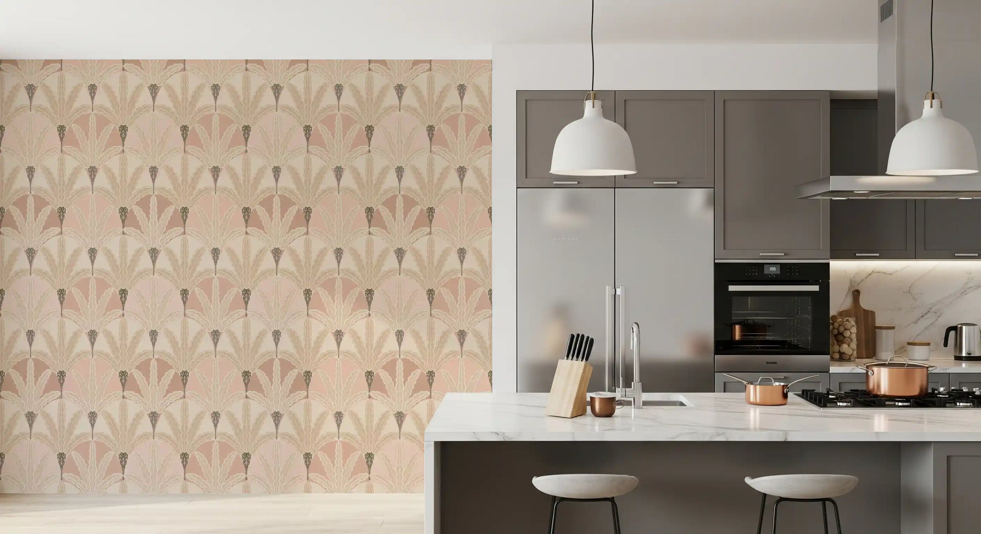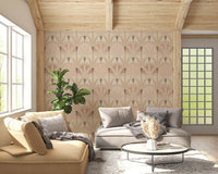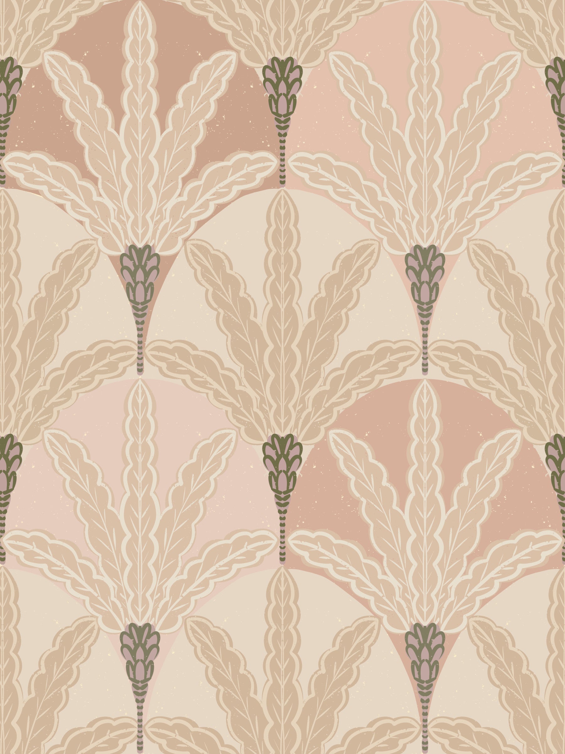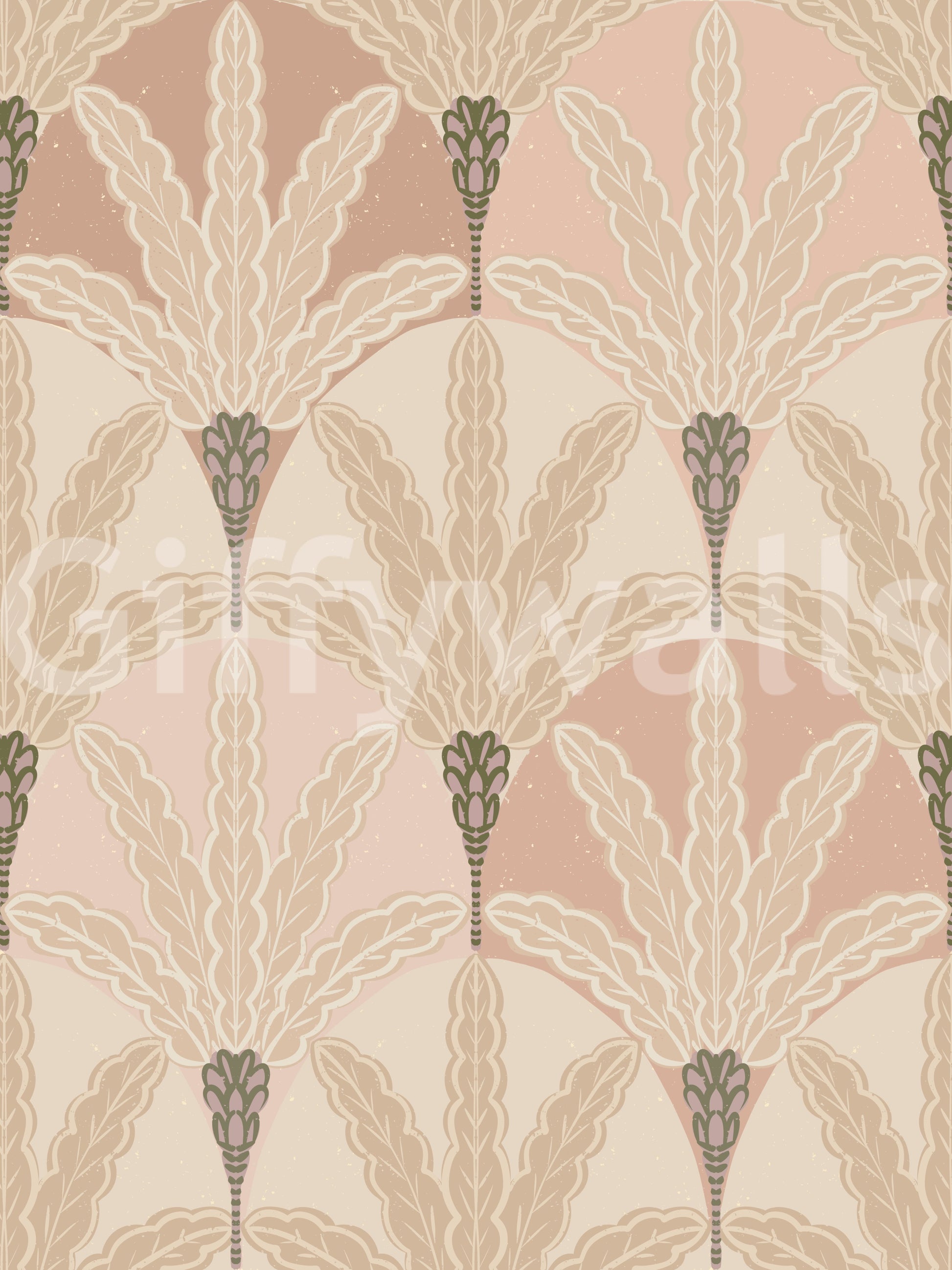 Adorn your living space with this exquisite wallpaper for walls, featuring an elegant Art Deco-inspired botanical pattern. Stylized fan-like leaves and subtle bud motifs repeat across the surface, creating a sophisticated and timeless design. The muted color palette of blush pinks, soft beiges, and hints of olive green and lavender delivers a serene and harmonious ambiance. A delicate distressed texture adds vintage charm, giving the impression of aged beauty. This design elevates any interior, bringing a sense of luxurious calm and refined elegance. Perfect for creating a feature wall in a tranquil bedroom, a chic living room, or an inviting entryway, it transforms rooms into elegant sanctuaries with its unique, understated glamour.