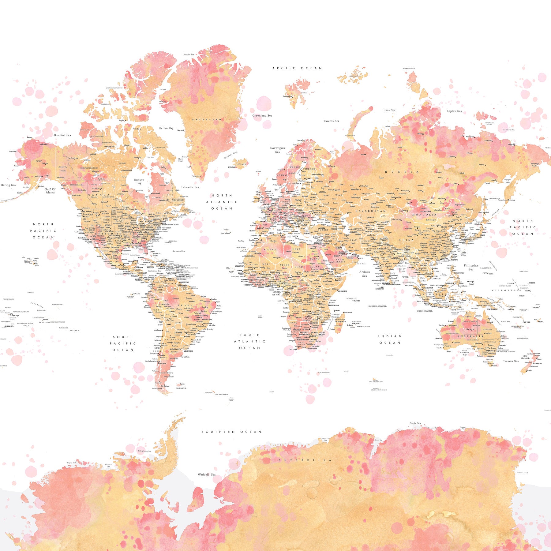 Brighten your walls with the cheerful tones of the Blush Tint World Map Wallpaper. This design pairs soft peach and rose-pink splashes with a detailed map layout, making it ideal for kids’ rooms, study areas, or playful living spaces. The watercolor effect adds charm, while labeled countries keep it informative. Whether you’re decorating a creative corner or inspiring young minds, this wallpaper blends style with function. The warm color palette adds a sense of fun without overpowering your interior, making it a lovely choice for modern and artistic wall design. A simple way to turn a map into something memorable.