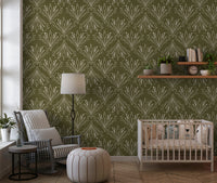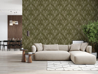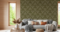 A hand-drawn boho folk floral wallpaper inspired by Art Nouveau elegance, featuring earthy olive green tones and retro botanical charm. This organic pattern brings balance, warmth, and natural sophistication to interiors, making it ideal for feature walls in living rooms, bedrooms, offices, studios, and boutique spaces.