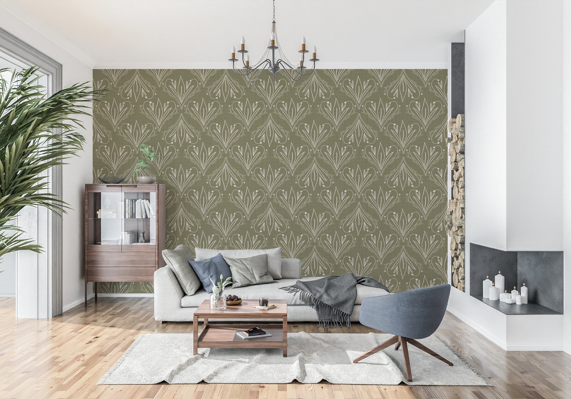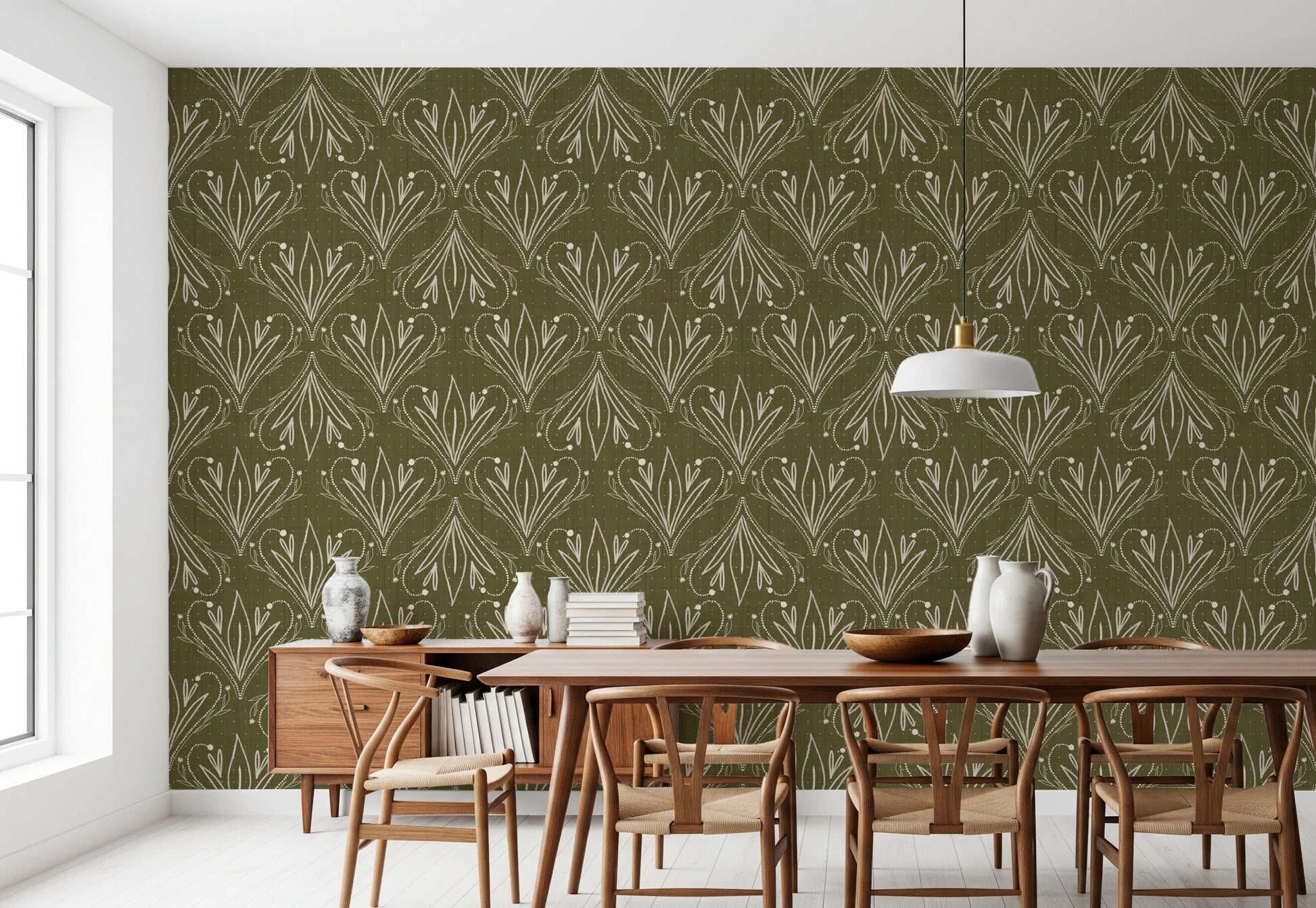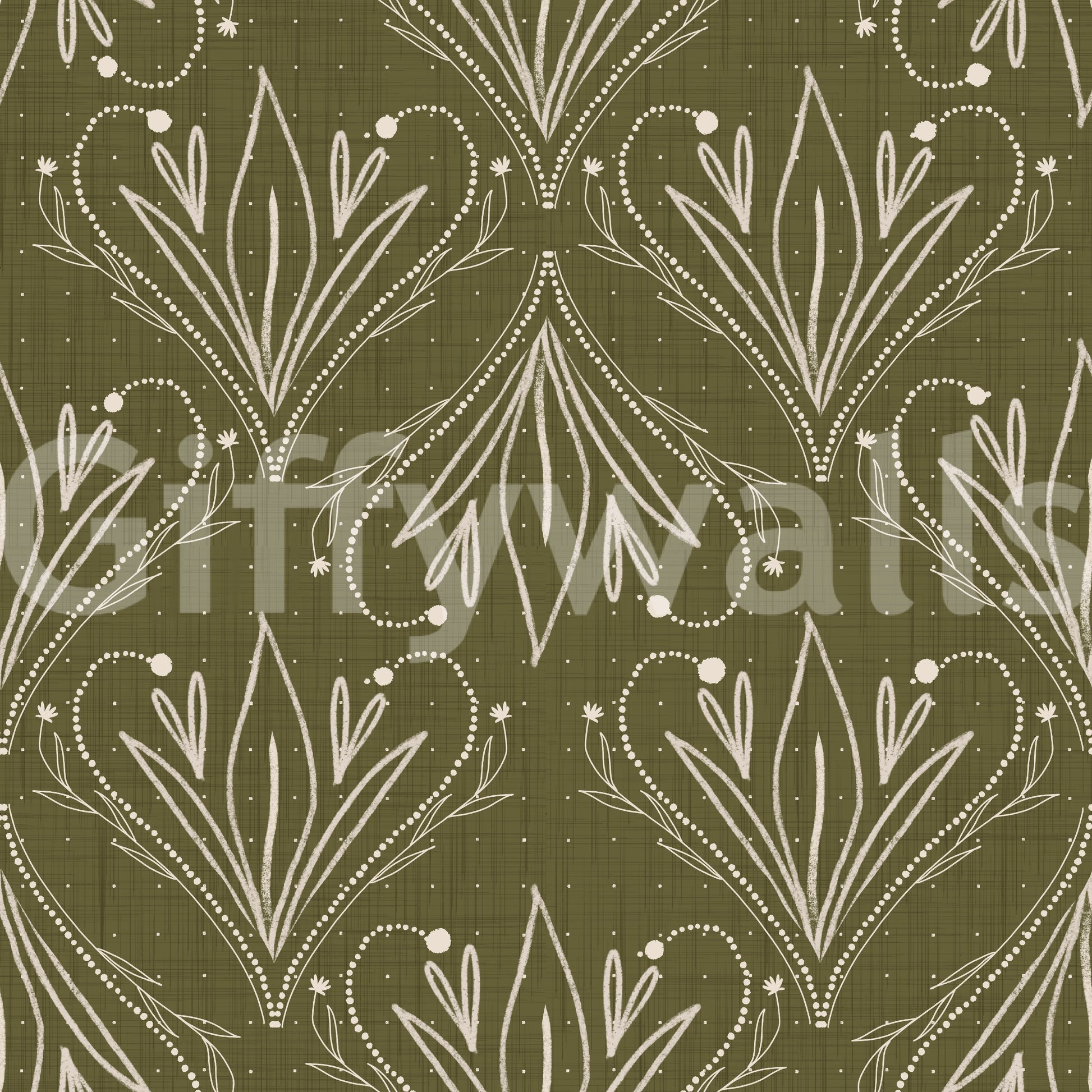 Boho Art Nouveau Folk Floral Olive Green Wallpaper – Hand Drawn Wallpaper⁠