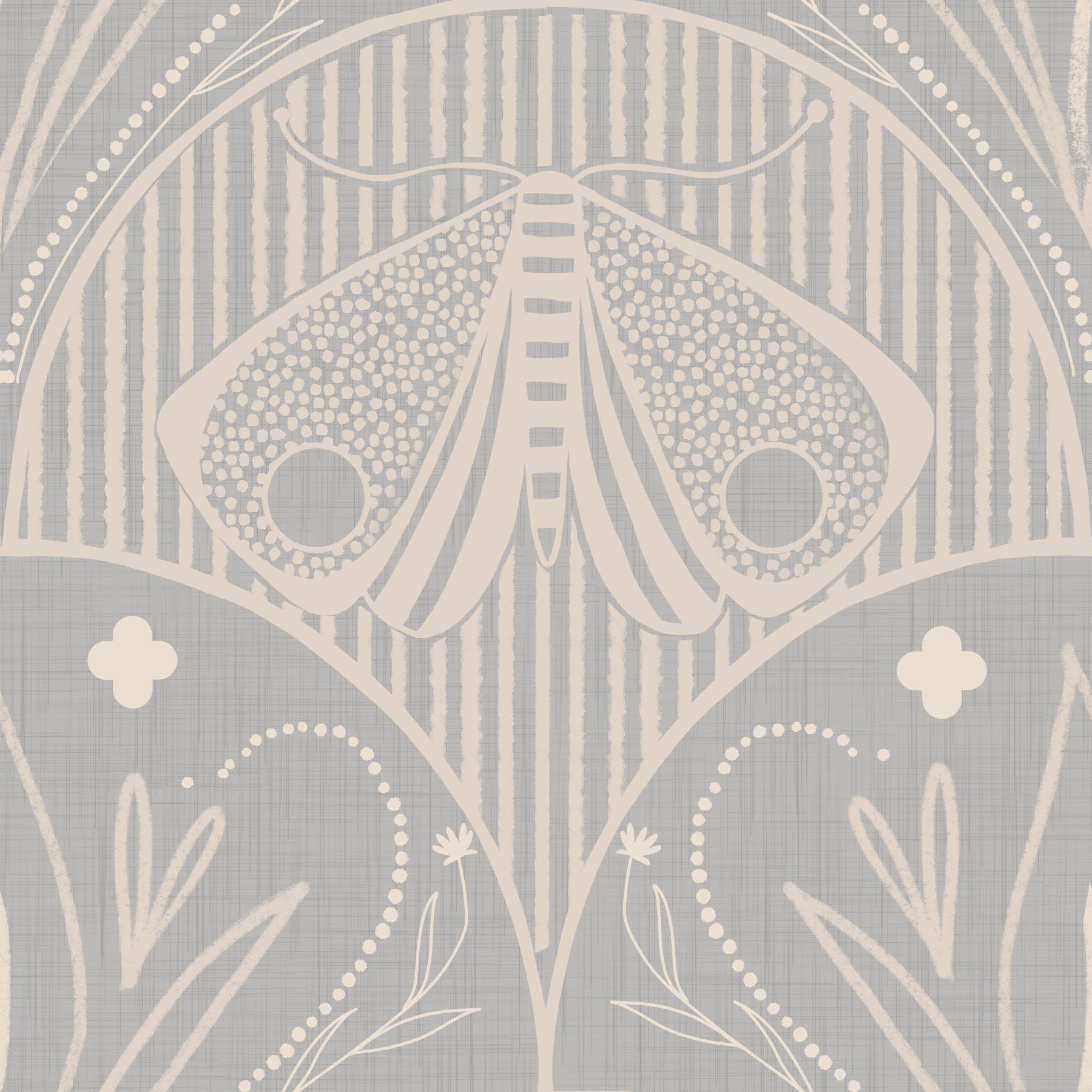 Geometric curved Boho Art Nouveau Scallop Butterfly Floral inor Light Grey moth wallpaper design.