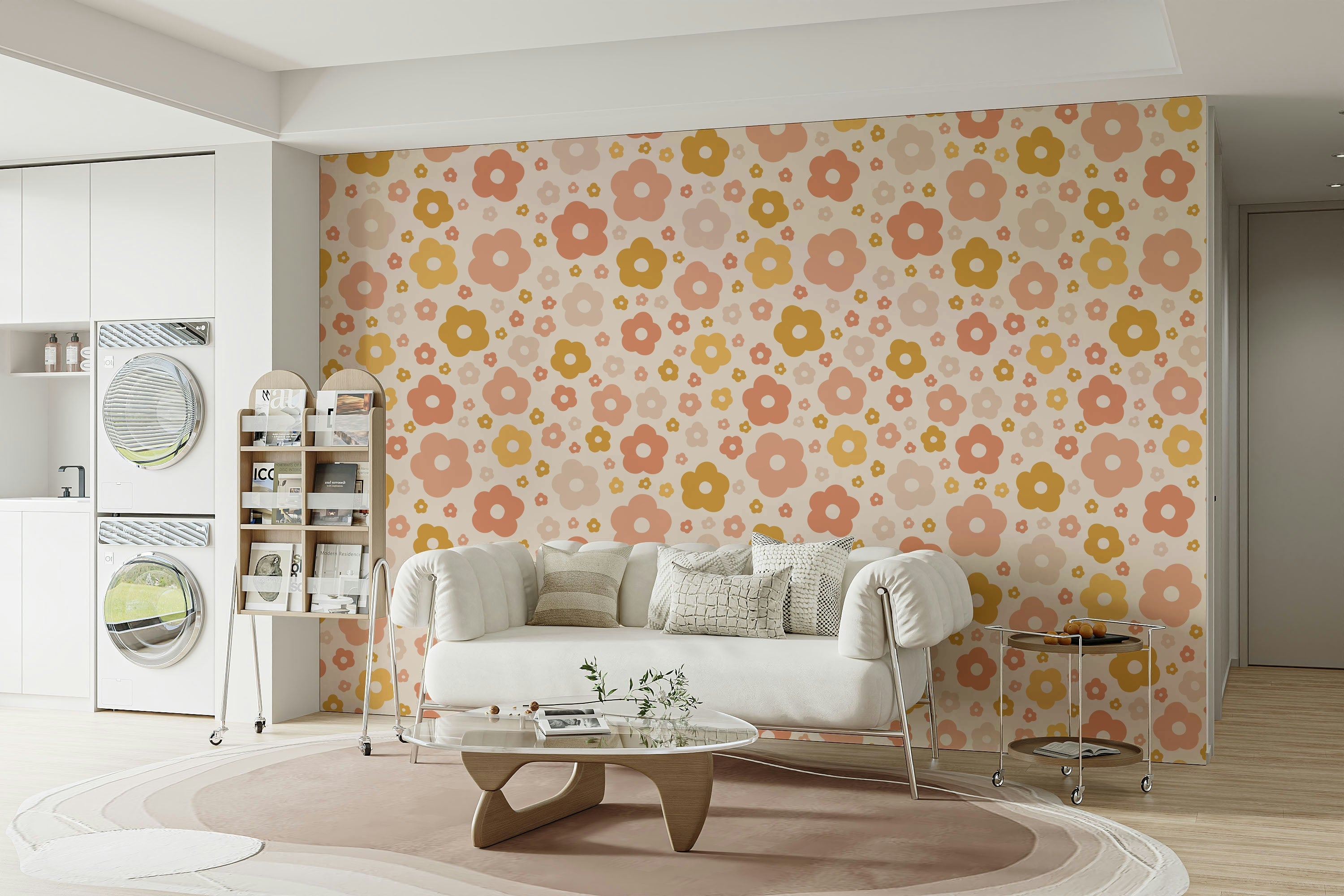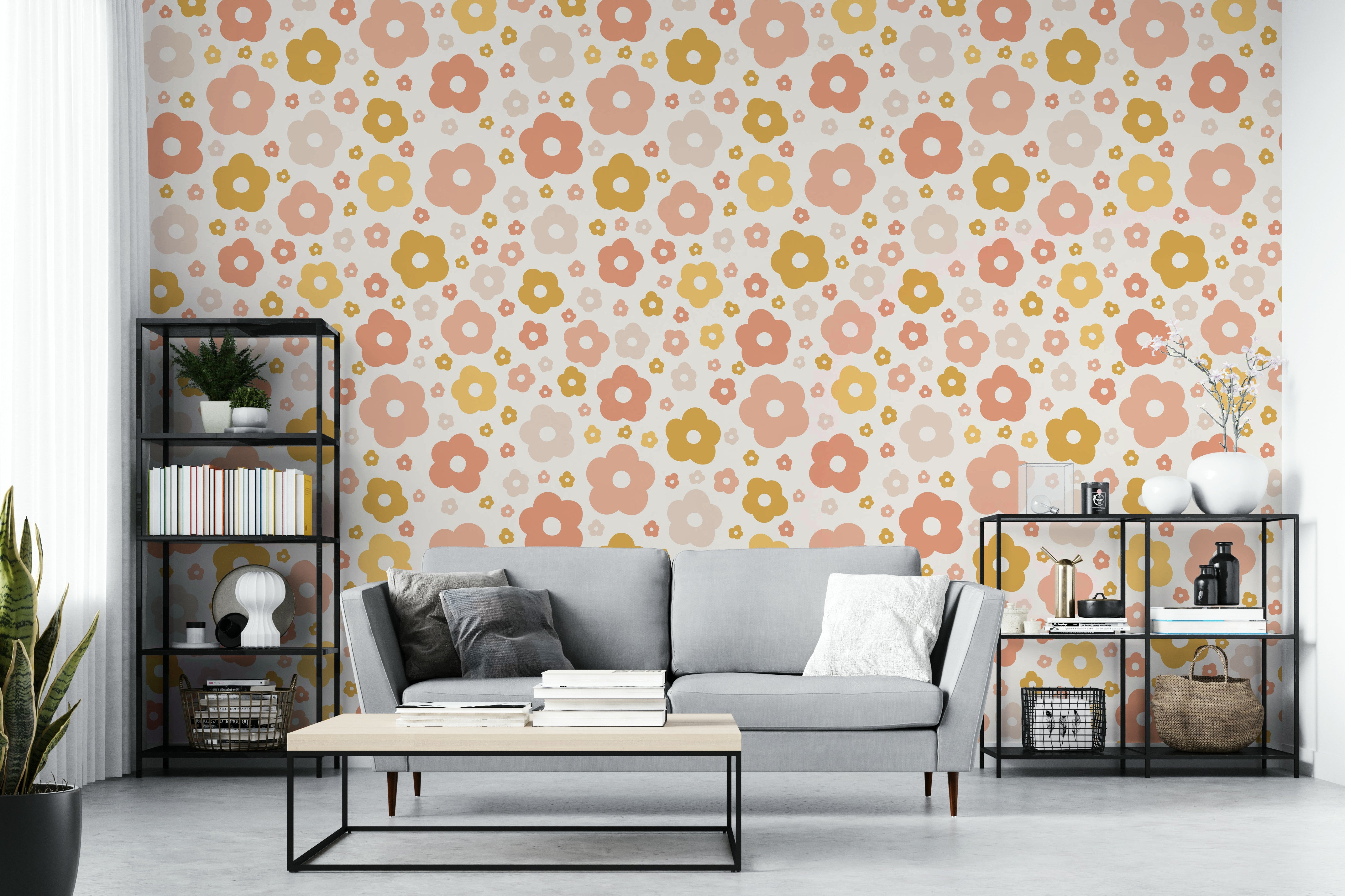 Embrace the free-spirited charm of Boho Daisies, a delightful wallpaper featuring a whimsical scattering of stylized daisies. Soft, earthy tones of blush pink, creamy beige, and golden mustard yellow create a calming and cheerful atmosphere. The simple yet elegant flower design is reminiscent of vintage 70s aesthetics, perfectly capturing the boho spirit. This wallpaper is ideal for adding a touch of relaxed elegance to any digital device, bringing a burst of sunshine and effortless style to your screen.
