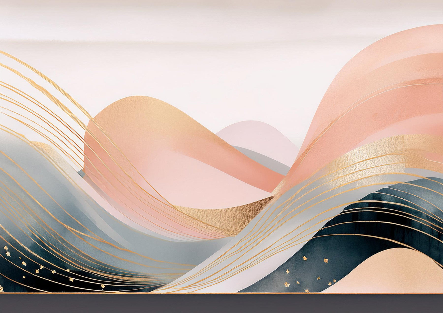 This wallpaper presents a captivating abstract landscape, featuring soft, flowing hills in muted pinks, blues, and grays. Delicate gold lines dance across the undulating forms, creating a sense of movement and serenity. Subtle gold speckles add a touch of magic, resembling distant stars scattered across a twilight sky. The overall mood is calm and tranquil, evoking a feeling of peace and quiet contemplation. Perfect for adding a touch of sophisticated elegance to any space, this wallpaper is a mesmerizing blend of color and texture.