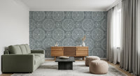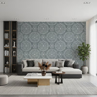 Evoke a sense of serene celebration with this captivating wall covering. "Boho Fireworks Grunge Calming Blue" artfully blends the relaxed essence of bohemian style with a touch of festive whimsy. The calming blue backdrop, reminiscent of twilight skies, is overlaid with an intricate pattern of white circles and dashes suggestive of stylized fireworks. A subtle grunge texture adds depth and character, giving the design a lived-in, vintage feel. Perfect for creating a tranquil yet subtly dynamic atmosphere, this design infuses spaces with a unique blend of comfort and understated elegance. It is perfectly placed in any room to bring a relaxing and creative environment.