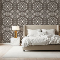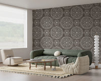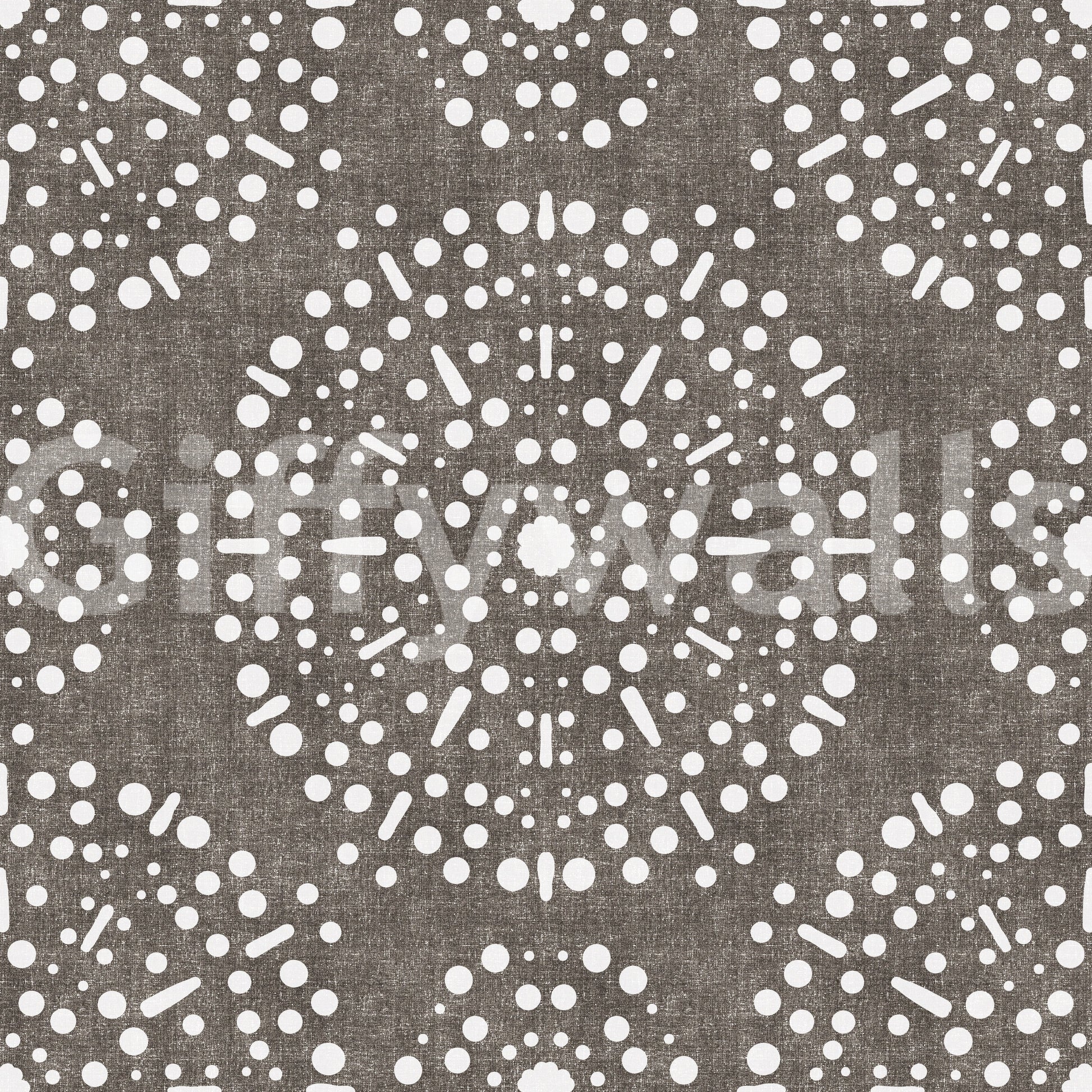 Embrace the unexpected with 'Boho Fireworks Grunge Dark Bark,' a wall covering that marries rustic charm with a touch of bohemian whimsy. This design evokes the feeling of a muted celebration against a backdrop reminiscent of aged bark. The intricate pattern of scattered circles, suggestive of bursting fireworks, creates a captivating visual texture. The overall effect is an intriguing blend of raw, organic elements and celebratory patterns. The muted tones and weathered appearance offer a grounded yet artistic presence, perfect for adding character and depth to any space. Invite the spirit of creative expression into your home with this unique and captivating wall décor.