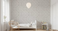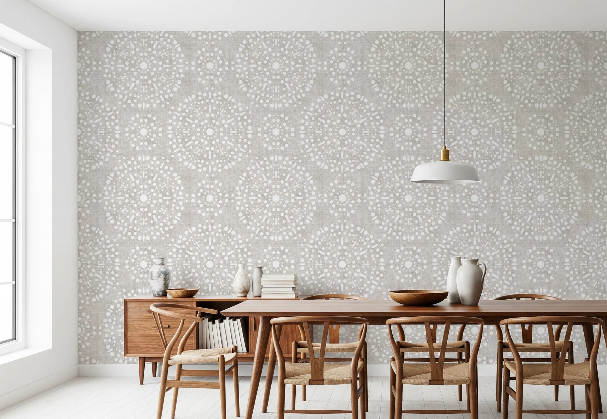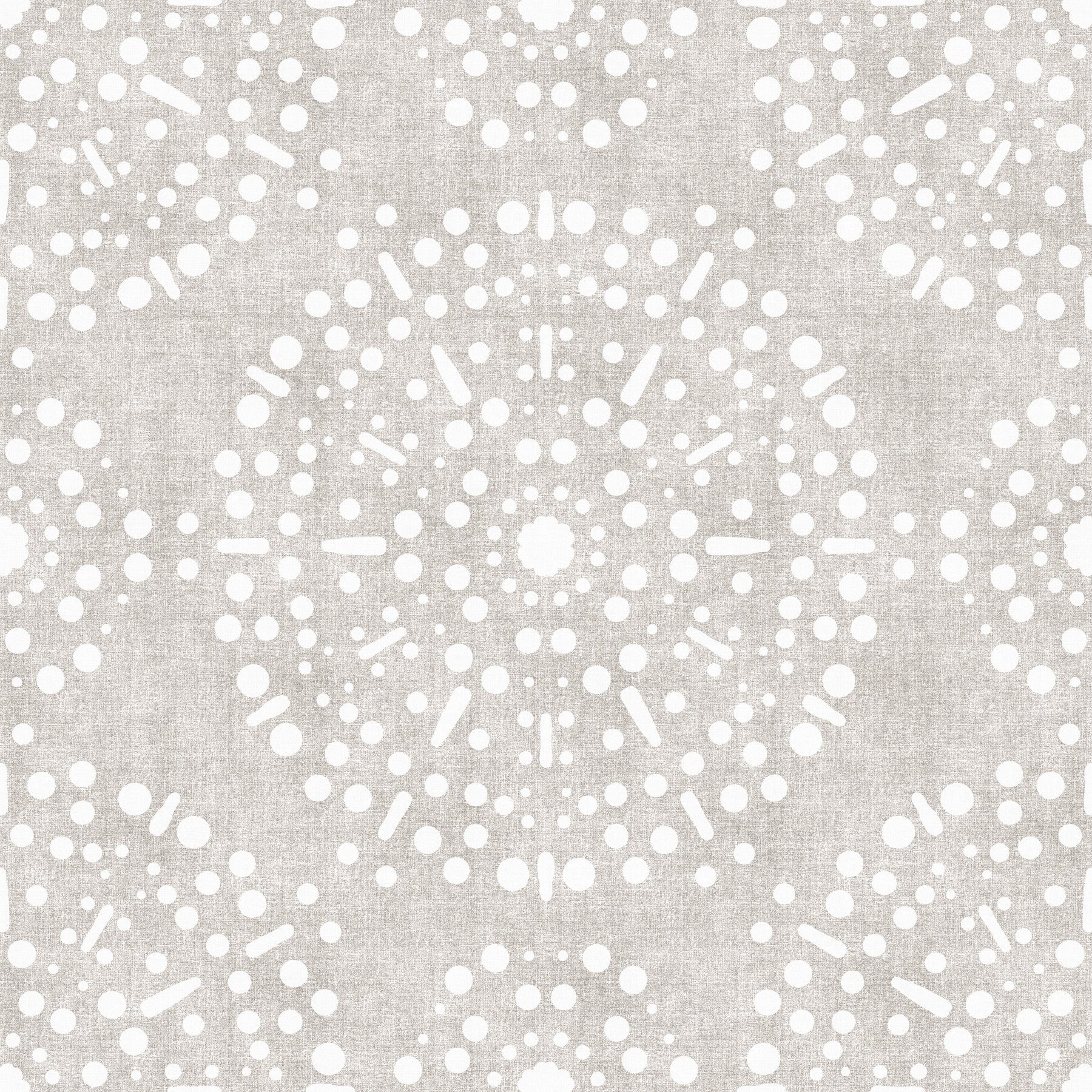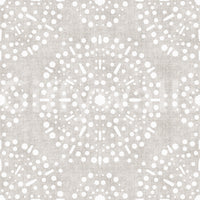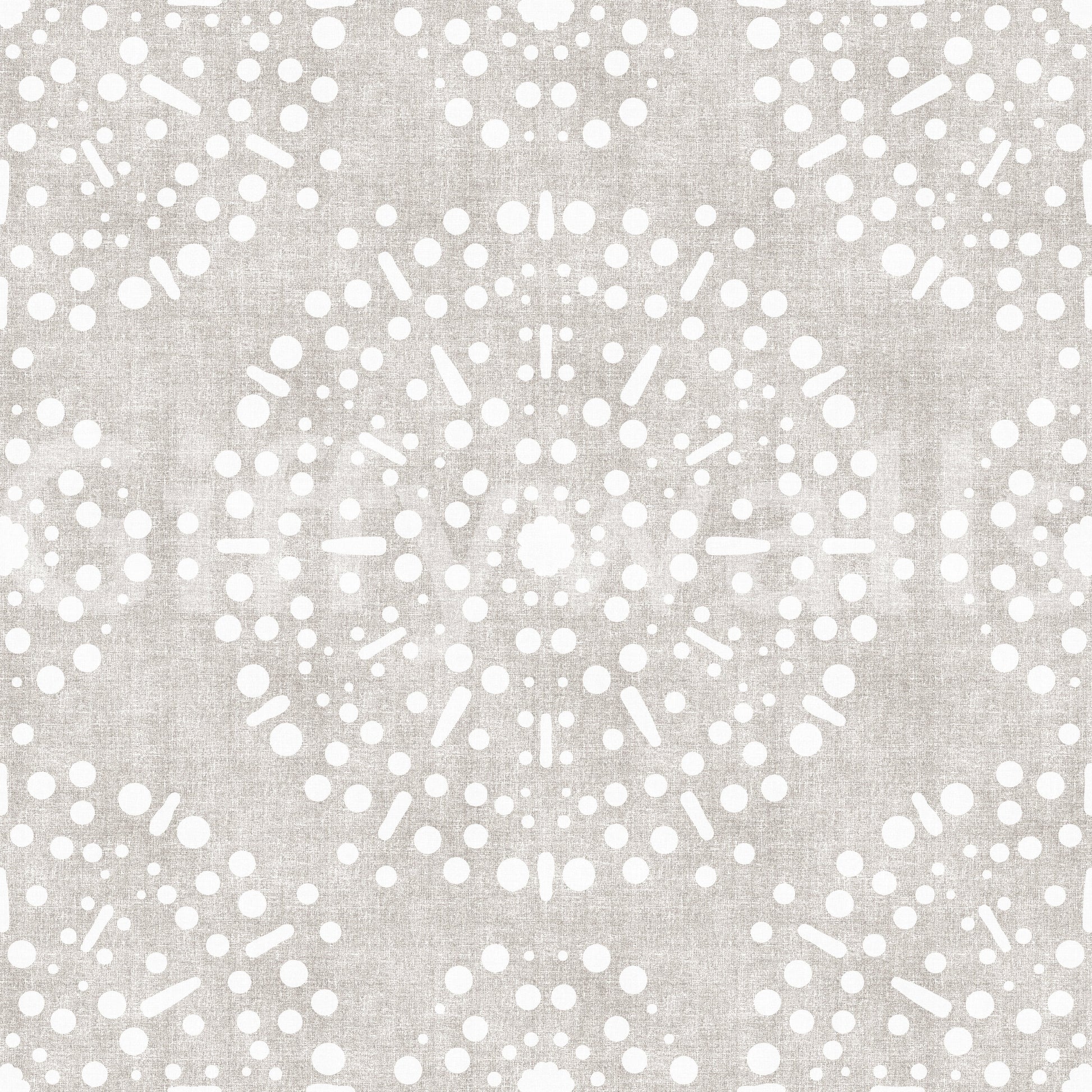 Celebrate a quiet rebellion with this wall covering that echoes bohemian spirit and a touch of raw elegance. The 'Boho Fireworks Grunge Neutral' pattern offers a sophisticated yet relaxed statement for your walls. Imagine delicate bursts of starlight rendered in subtle neutral tones against a textural, almost distressed background. This design evokes the mesmerizing dance of fireworks on a muted canvas, creating a subtle interplay between order and chaos. The off-white dots and dashes form a circular design over a light textured neutral background, offering a visually intriguing backdrop. It brings a refined, artistic flair to your spaces, perfect for those who appreciate understated glamour.