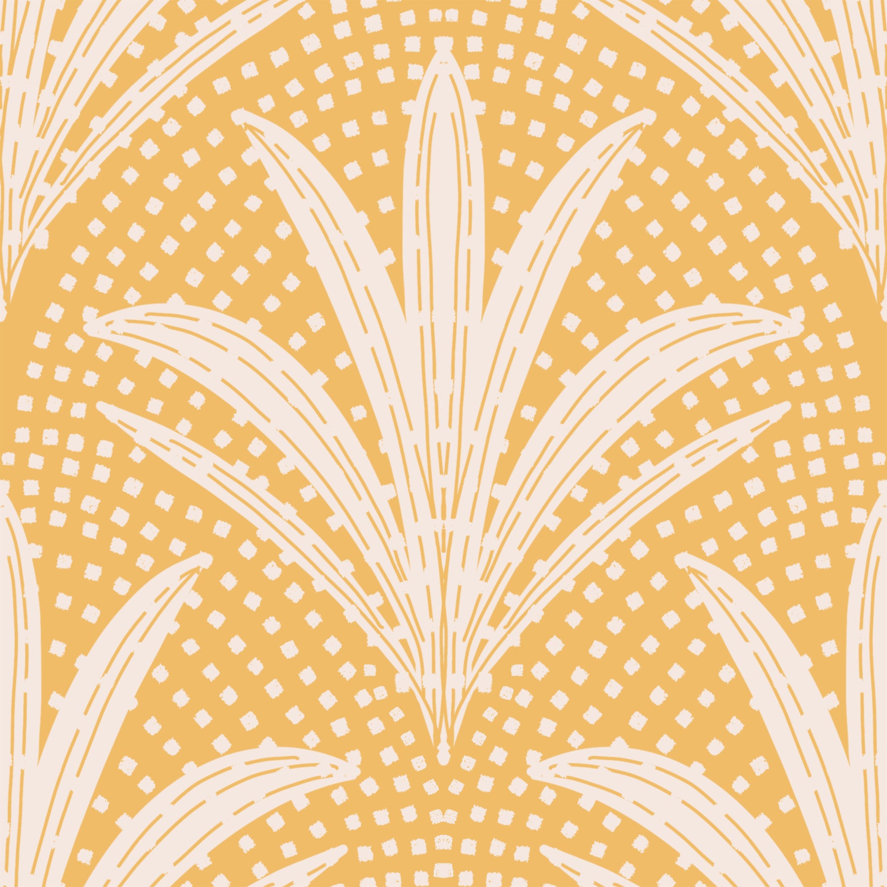 Embrace the warmth and serenity of this Boho Rustic Palm Radiance Golden Ochre wallpaper. Styled with a golden ochre base, the design features stylized palm fronds in soft off-white, creating a radiant, almost sunlit effect. A subtle textured background of small, hand-drawn squares adds a touch of rustic charm, enhancing the overall bohemian vibe. This wallpaper perfectly blends organic shapes with a geometric undertone, offering a tranquil and inviting atmosphere ideal for any space seeking a touch of elegant, earthy sophistication. The balanced color palette and unique pattern make it a versatile choice for modern or traditional interiors.