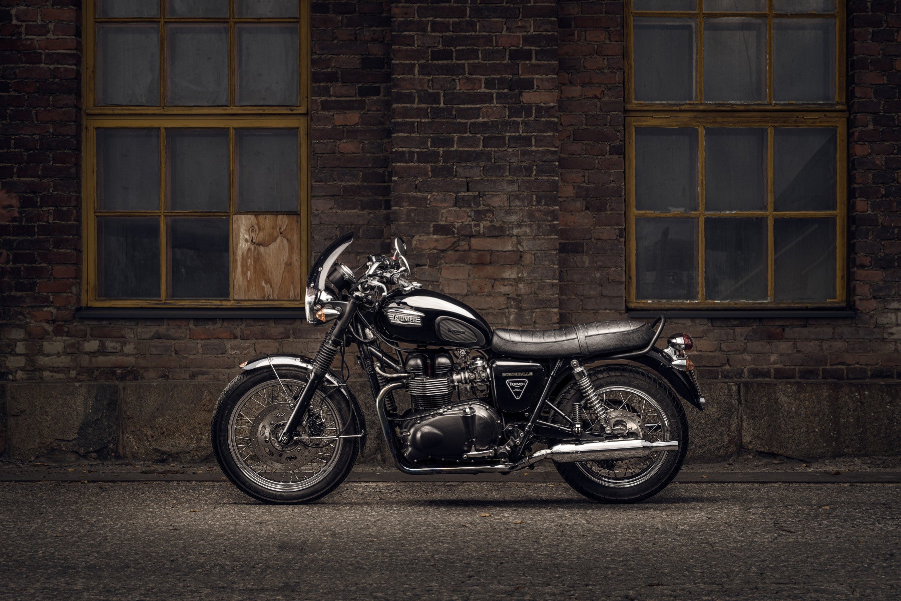 Capture the essence of classic motorcycling with Bonneville Ride. This wallpaper features a stunning Triumph Bonneville, poised and ready against a backdrop of weathered brick and aged windows. The bike's sleek black finish and gleaming chrome accents are beautifully contrasted by the rough texture of the brickwork, creating a visually compelling scene. The image evokes a sense of timeless style and the thrill of the open road. It's perfect for motorcycle enthusiasts, lovers of vintage design, or anyone seeking a touch of rebellious elegance for their digital space. Let the 'Bonneville Ride' wallpaper fuel your adventurous spirit every time you unlock your screen.