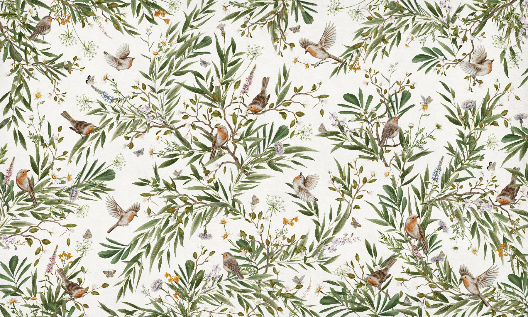 Horizontal scene of the colorful Botanical Aviary Wall Mural.