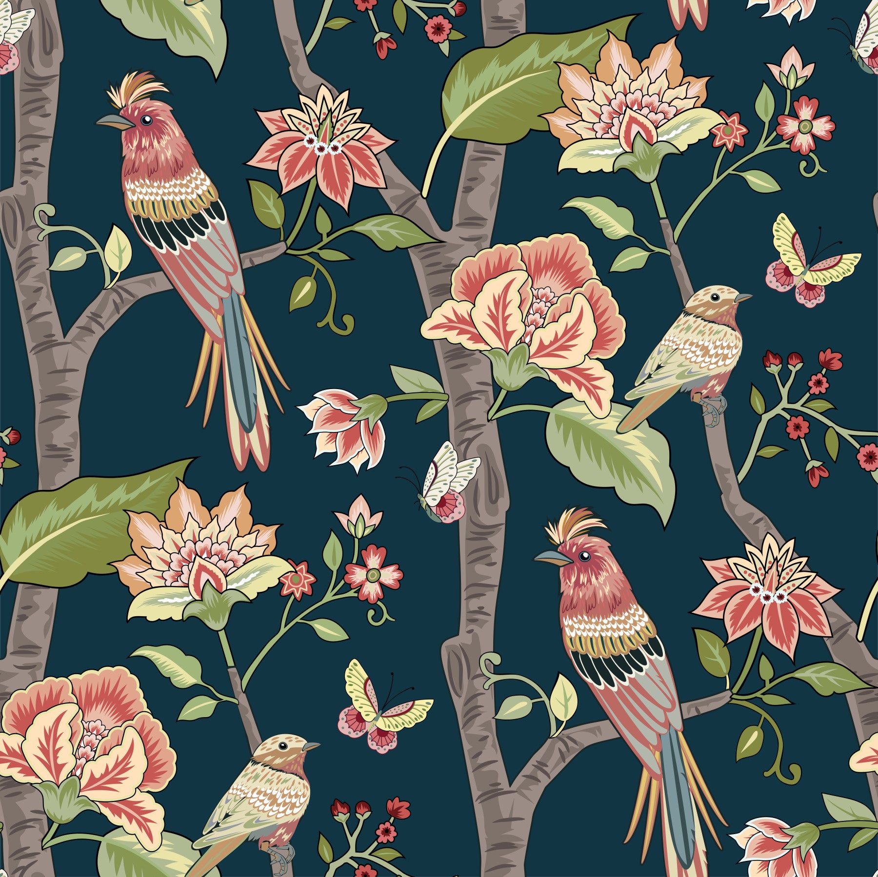 Whimsical avian uncommon pattern, Botanical Birds wallpaper for walls.