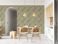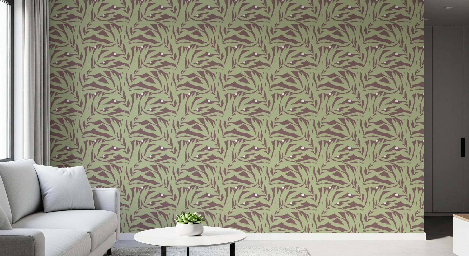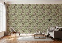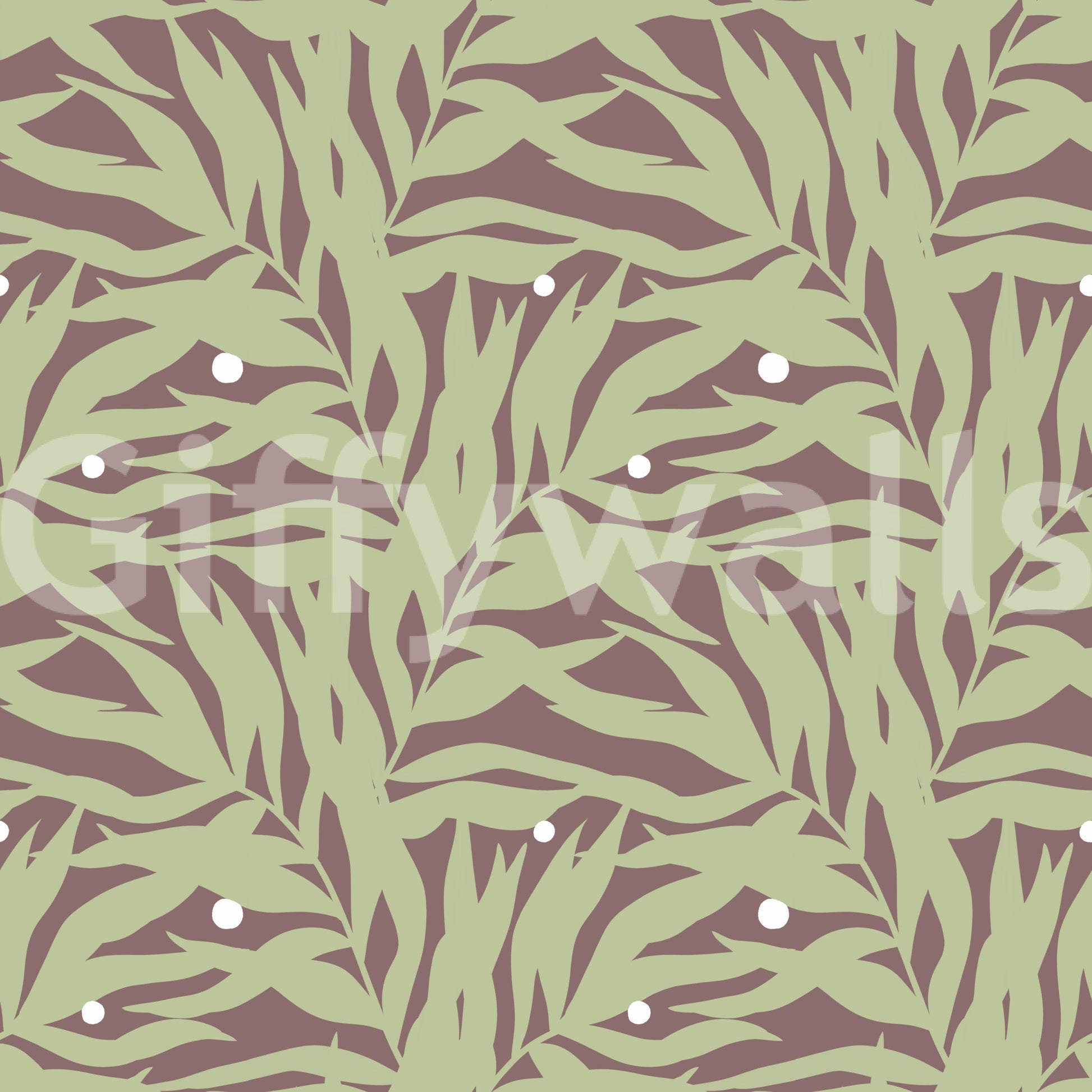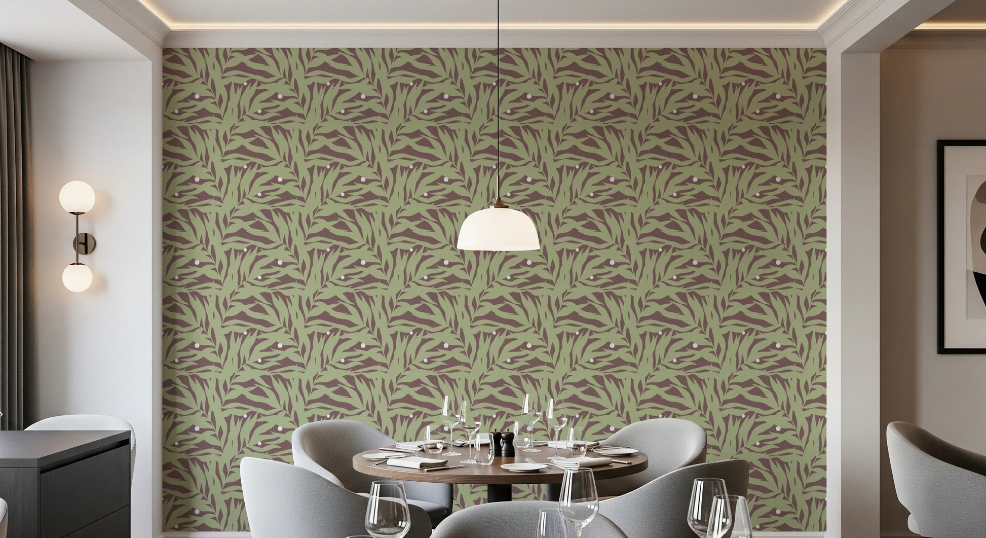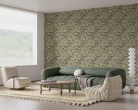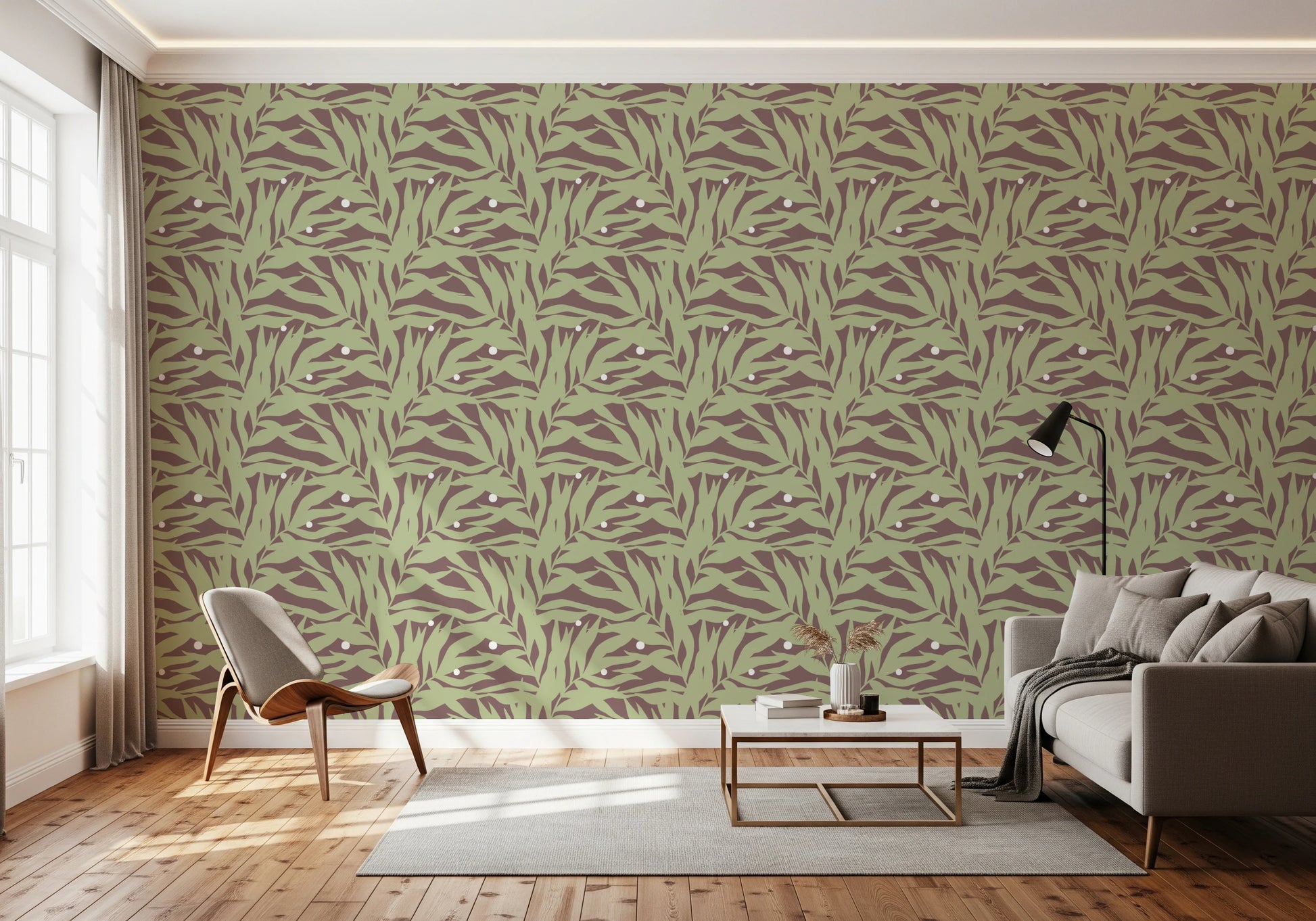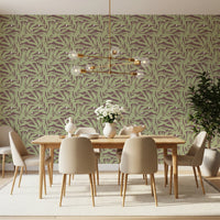 Introduce a touch of nature's serenity into your home with this captivating wallpaper for walls. The design showcases stylized green foliage against a muted mauve backdrop, creating a restful yet elegant ambience. green leaves, olive leaves, silvery green foliage, muted green tones, sage green, soft matte texture, narrow lanceolate leaves, botanical, Mediterranean aesthetic, natural texture, earthy palette, organic pattern, minimalist greenery, rustic charm, herbal, delicate stems, subtle shimmer, dusty green, fresh foliage, calming nature, garden detail, branch sprigs, wild grove, timeless botanical