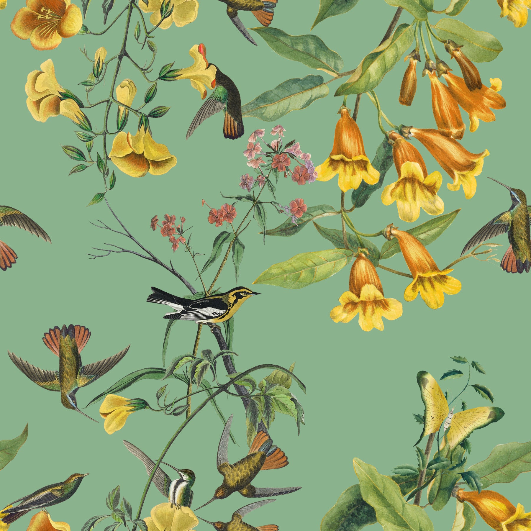 Transform any room with this captivating botanical scene. This wallpaper features delicate hummingbirds hovering around golden trumpet flowers, all set against a peaceful green backdrop. The design adds a touch of elegance to your walls. Use this wallpaper for walls in living rooms, bedrooms, or dining rooms to create a welcoming and stylish atmosphere. The design enhances interiors with its natural beauty, bringing a sense of calm and sophistication.