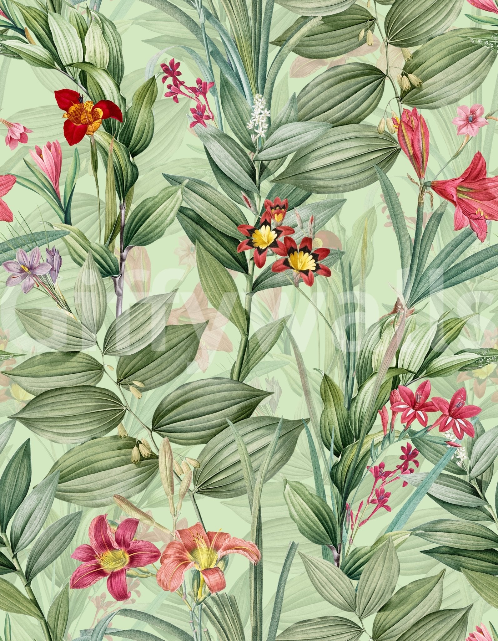 Immerse yourself in the serene beauty of 'Botanical Rhapsody,' a wallpaper design that captures the essence of a lush garden. Delicate watercolor illustrations of lilies, daylilies, and other exotic blooms are meticulously rendered against a soft, pale green backdrop. The intricate details of the leaves and flowers create a captivating and tranquil atmosphere, perfect for adding a touch of nature-inspired elegance to any room. The seamless pattern ensures a harmonious flow, inviting a sense of calm and sophistication.