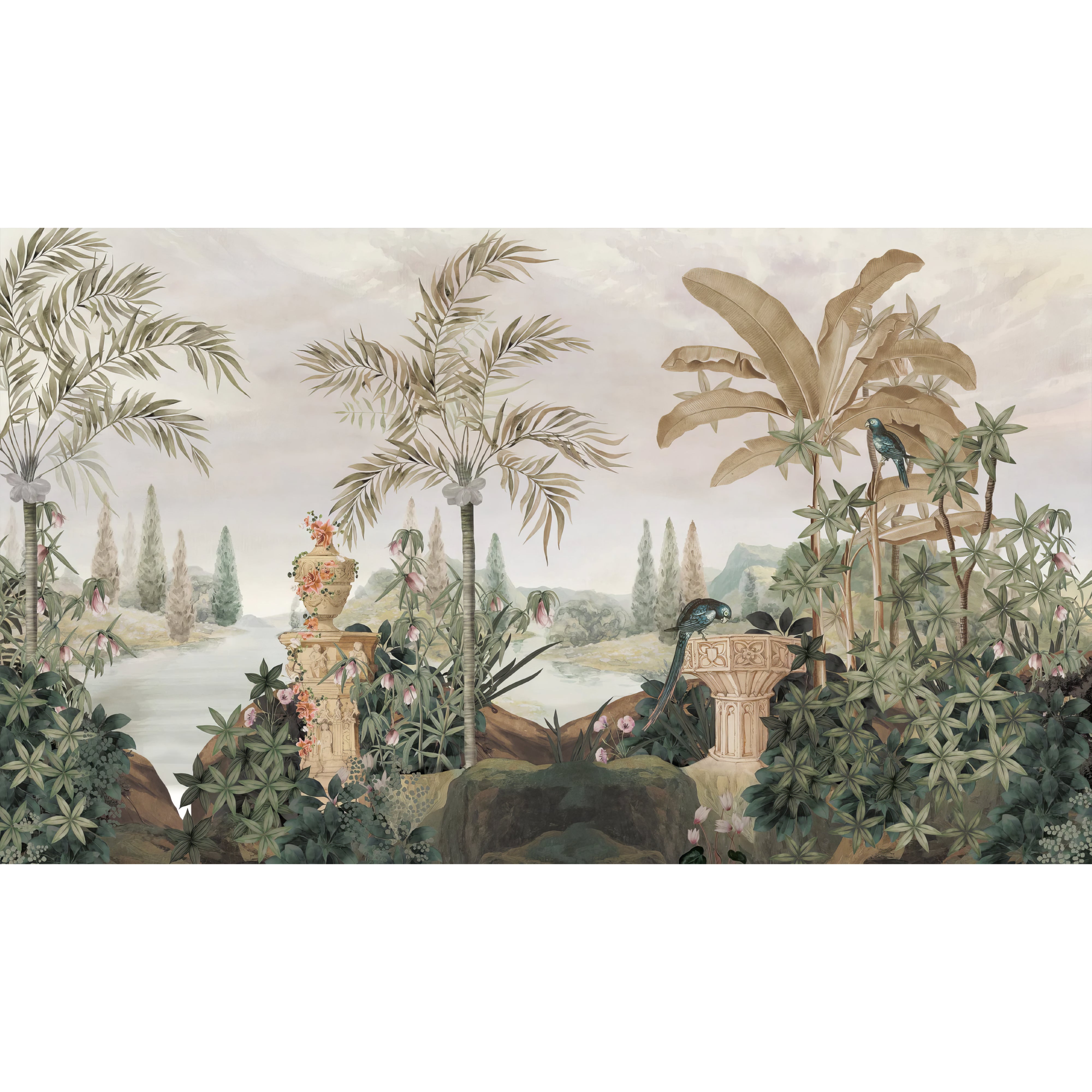Escape to a bygone era of elegance with the Botanical River Dreams wall mural. This breathtaking design features a vintage tropical landscape, complete with swaying palm trees, exotic birds, and classical stone architecture set against a misty river backdrop. The soft, muted tones create a sophisticated atmosphere, perfect for adding depth and character to your living room or master bedroom. Ideal for those seeking antique style wall decor, this scenic jungle mural turns any blank wall into a work of art. Elevate your home with this nature inspired wall covering that blends historical charm with botanical beauty.