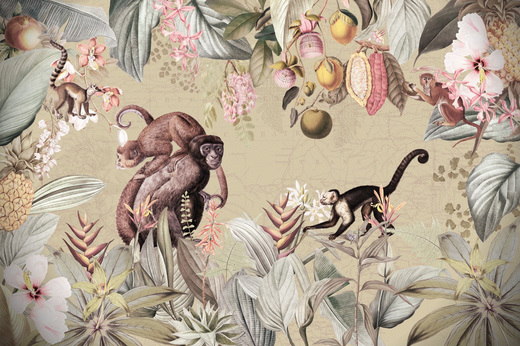 Embark on a visual journey with this captivating wallpaper. A faded map underpins a breathtaking scene of meticulously illustrated tropical flora and fauna. Monkeys swing through a canopy of banana leaves, orchids, and hibiscus, while cocoa pods and other exotic fruits hang heavy with ripeness. The muted colour palette evokes a sense of calm exploration, making it perfect for those seeking a tranquil yet adventurous atmosphere. The antique map detail adds a layer of depth and history, transforming any space into a botanical haven.
