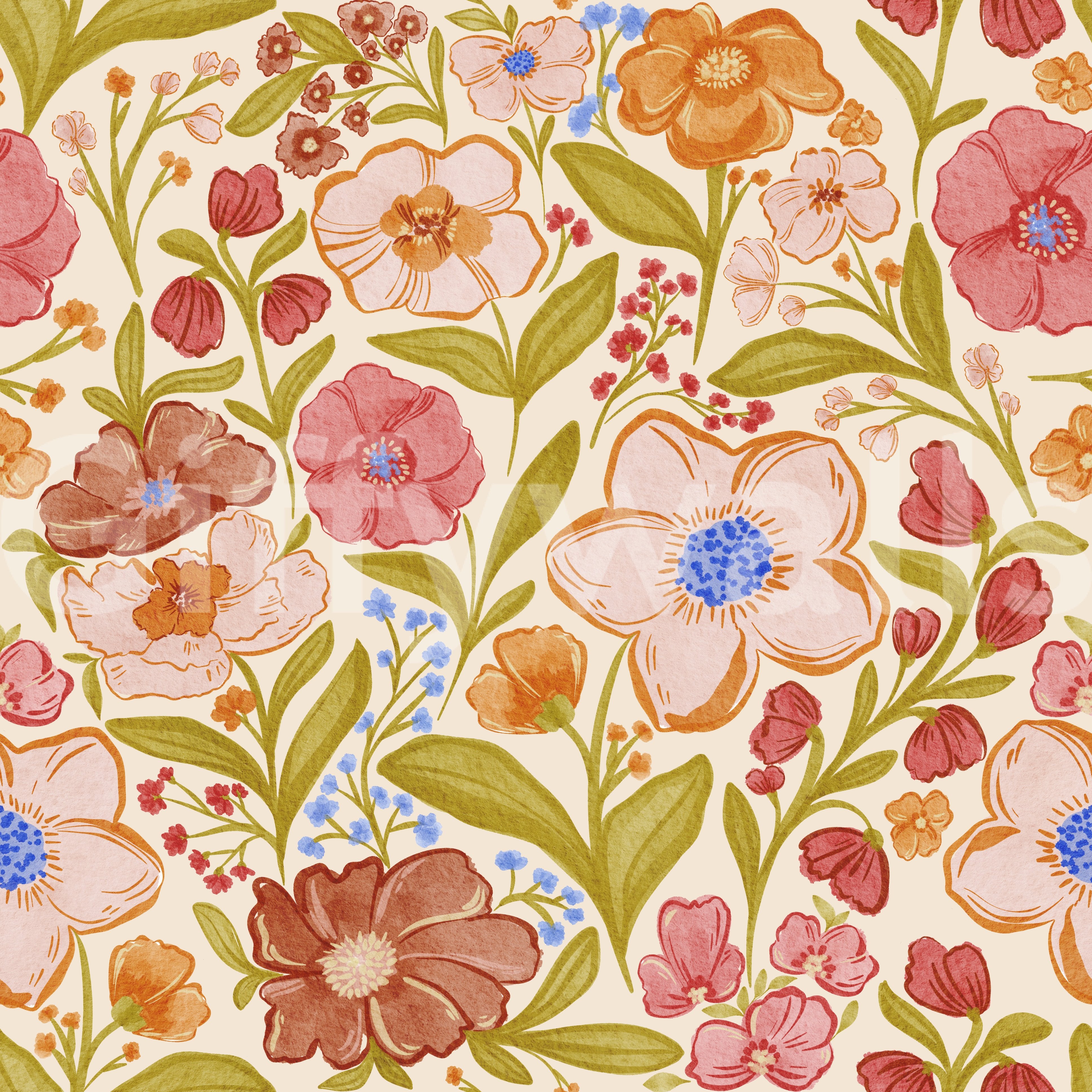 'Botanical Watercolor Dreams' transports you to a world of gentle beauty. This wallpaper features a captivating watercolor pattern of soft-hued blossoms and leaves, rendered with delicate brushstrokes against a warm, off-white canvas. The earthy color palette—embracing subtle pinks, oranges, and reds—creates a soothing and harmonious ambiance, perfect for bedrooms, living rooms, or any area where tranquility is desired. The painterly details lend a unique, artistic touch, while the seamless pattern guarantees a sophisticated, cohesive look across your walls. Let the gentle beauty of nature inspire your interior design.