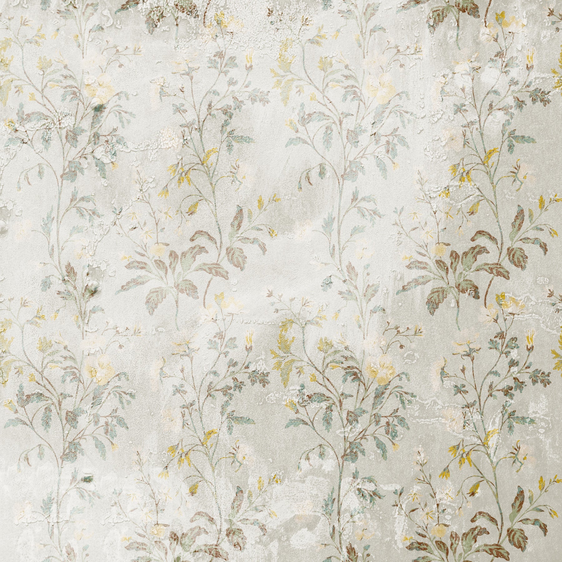 Immerse yourself in the subtle beauty of Botanical Whispers a wallpaper that evokes a sense of vintage charm and delicate serenity. Soft, muted tones of sage, ochre, and cream intertwine in a graceful dance of floral motifs, creating a visual tapestry that whispers of nature's quiet elegance. This design features slender stems adorned with dainty blossoms and intricately detailed leaves, all subtly textured against a gently distressed backdrop. The distressed elements add depth and character, lending the wallpaper an aged, almost antique feel. Perfect for creating a calming and sophisticated atmosphere, "Botanical Whispers" transforms any room into a tranquil sanctuary. Embrace the gentle allure of this design and let its botanical artistry whisper peace into your living space.