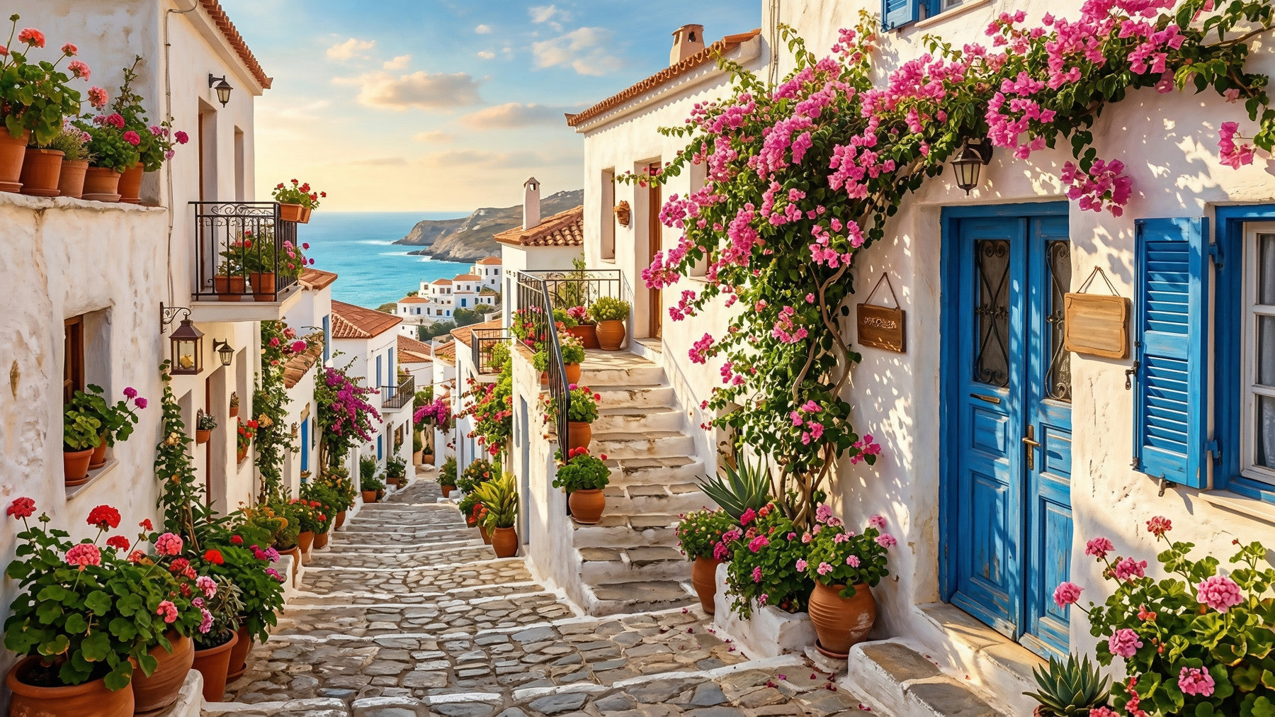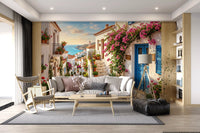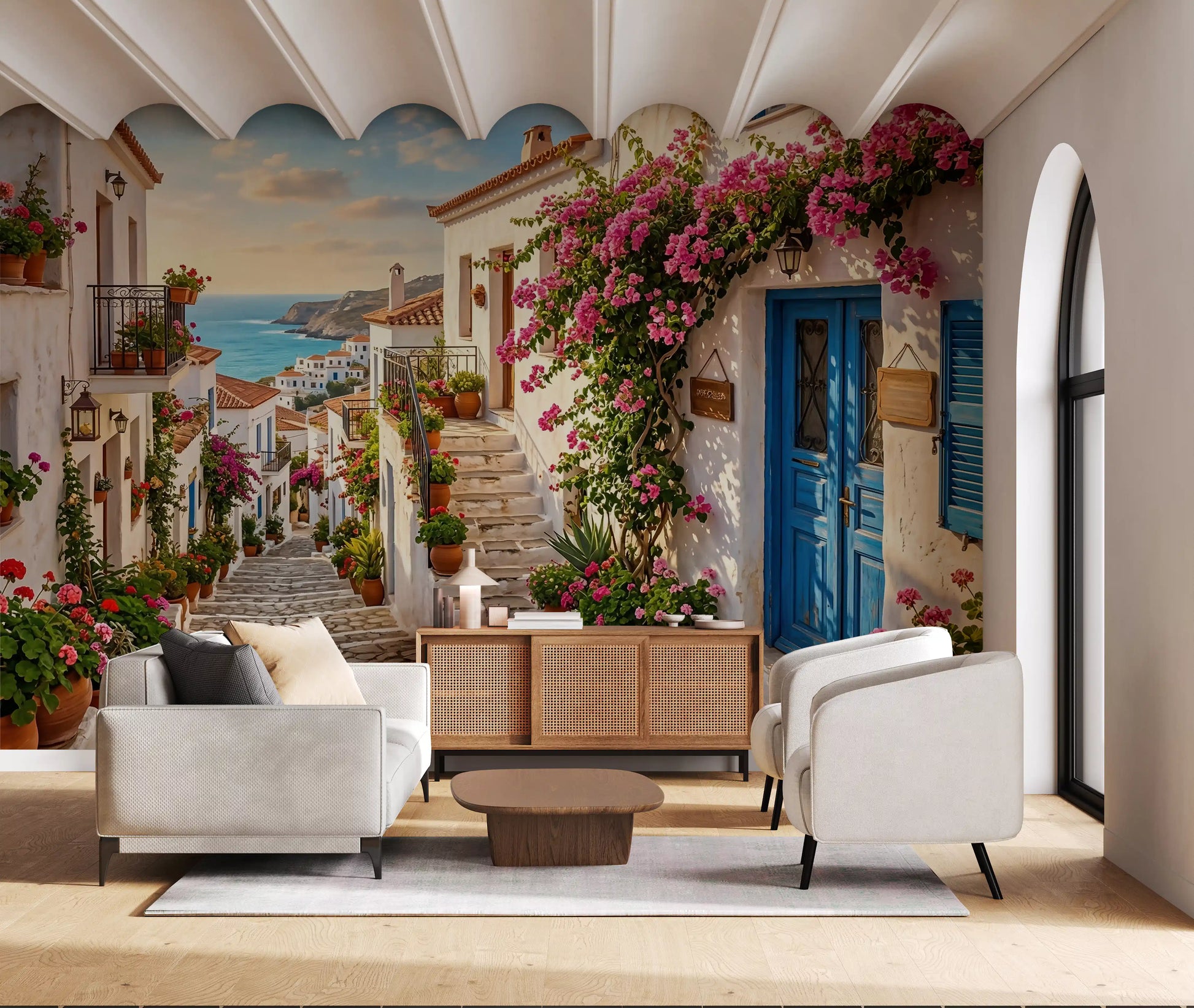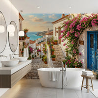 Transform your living space with this enchanting wallpaper for walls, capturing the timeless beauty of a Mediterranean village. Whitewashed buildings cascade down a cobbled pathway, adorned with cascades of vibrant pink bougainvillea. Bright blue doors and shutters add pops of cheerful color, creating a striking contrast against the sun-drenched walls. Terracotta pots overflow with lush green foliage and more blossoms, inviting the eye to wander down toward the shimmering turquoise sea. This design brings warmth and light into any room. It evokes a serene, inviting atmosphere perfect for a cozy living room, a sunlit dining area, a tranquil bedroom, or even a charming bathroom, instantly creating an idyllic escape.