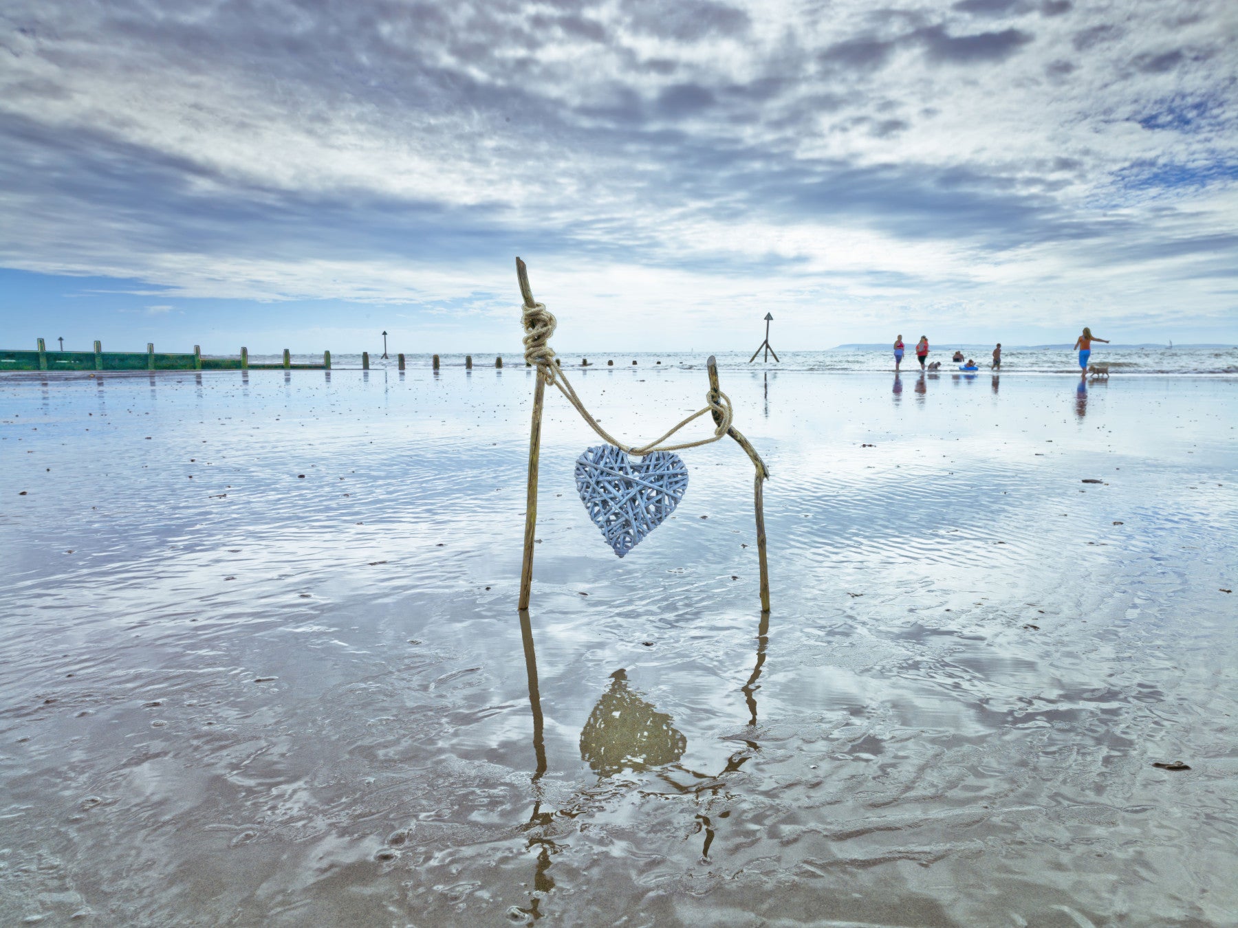 Bound by Love Wall Mural, woven heart on sticks on a wet beach.