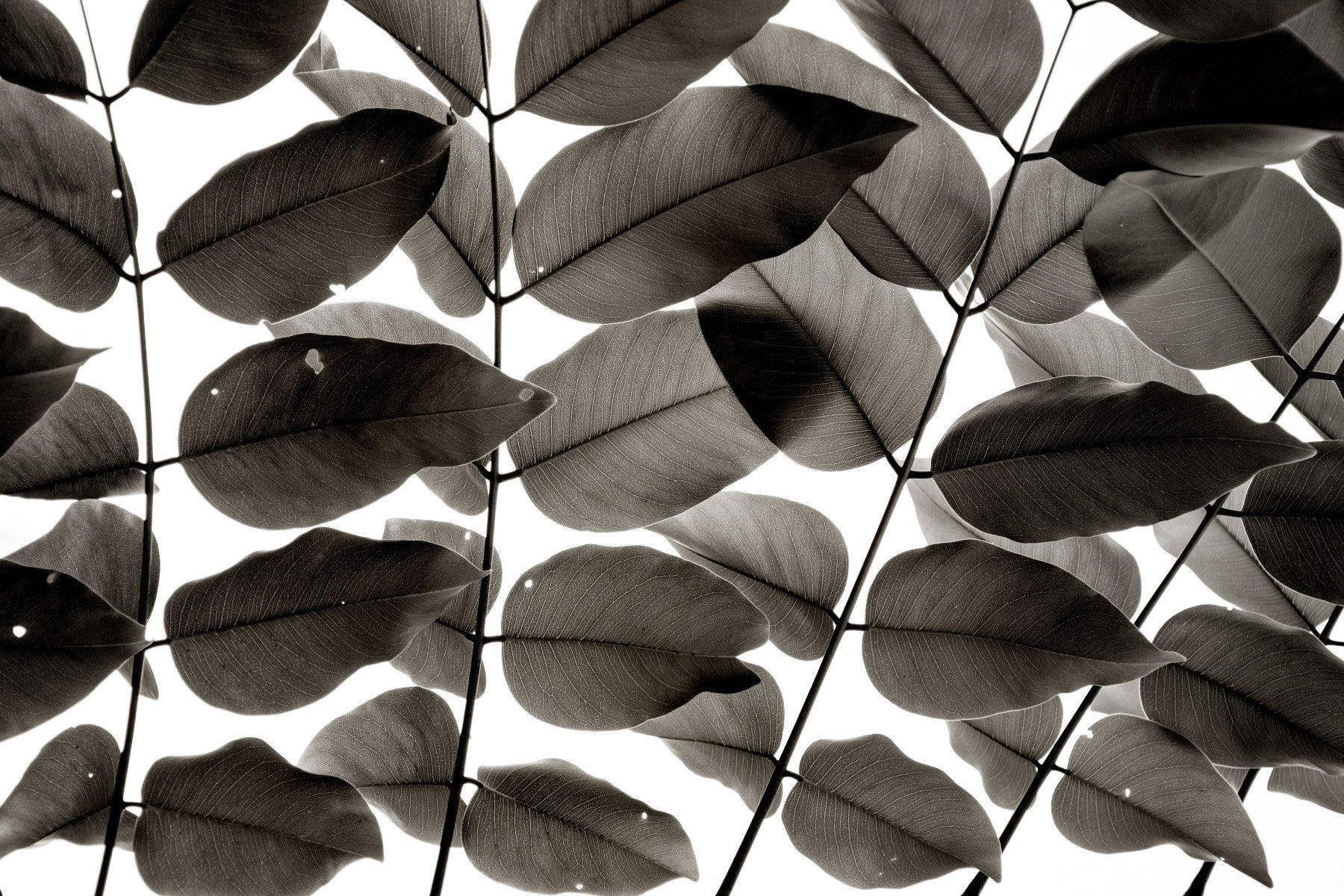 Immerse yourself in the serene beauty of 'Branches and Leaves I,' a captivating monochrome wallpaper that brings the tranquility of nature into your digital space. This image presents a close-up perspective of lush leaves and delicate branches, bathed in a soft, diffused light, creating a minimalist yet impactful aesthetic. The intricate details of the leaf veins and stem structures are rendered with exceptional clarity, inviting you to appreciate the subtle complexities of the natural world. The stark contrast between the deep shades of the foliage and the bright, airy background evokes a sense of calm and contemplation. Perfect for creating a peaceful and uncluttered environment, 'Branches and Leaves I' offers a sophisticated and timeless appeal. Transform your screen into a window to nature's quiet elegance with this striking wallpaper, designed to enhance any desktop or mobile device with its understated charm.