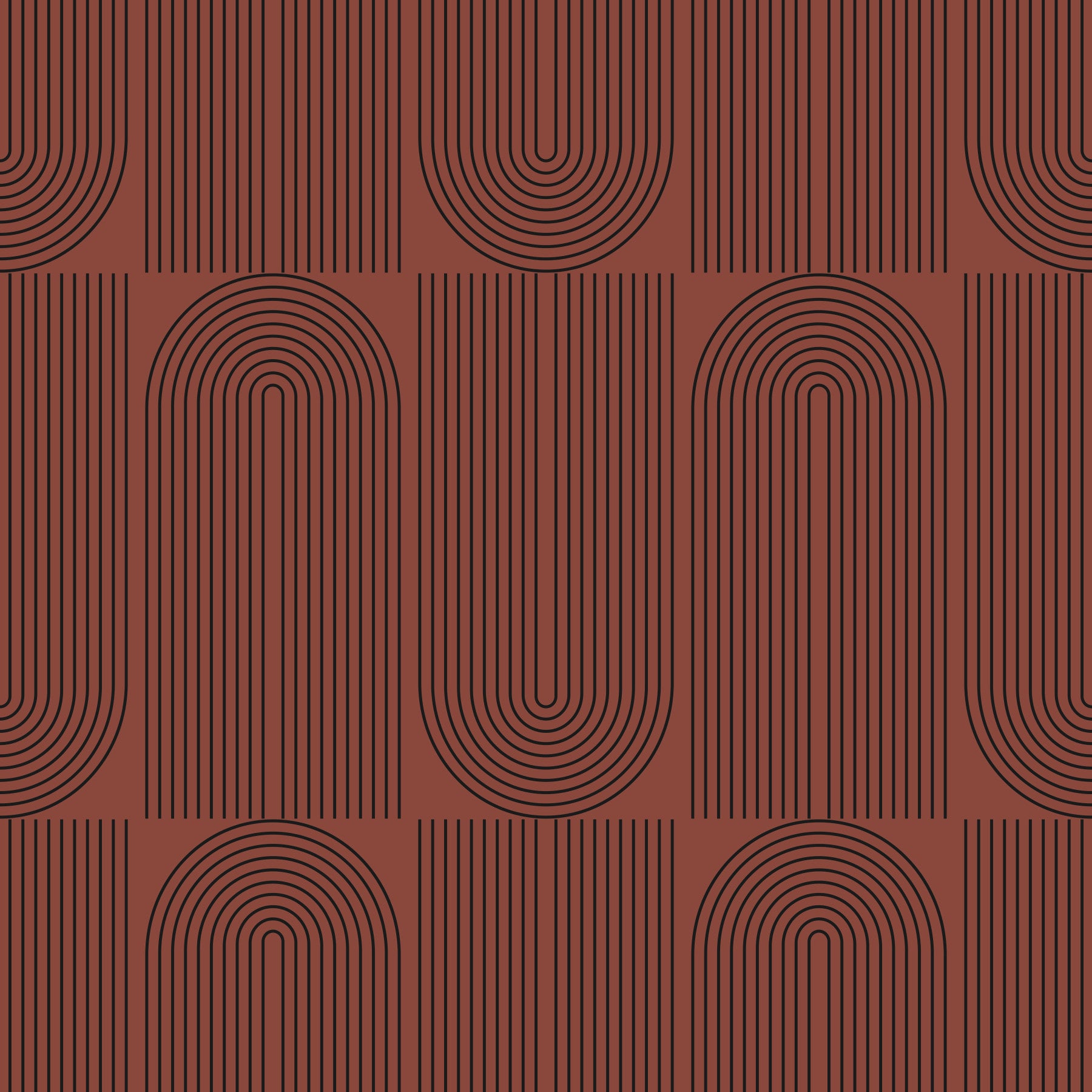 Elevate your space with this graphic wallpaper. Straight lines and smooth curves meet in a bold geometric design. The rust background enhances the deep brown linear pattern, adding a touch of rustic sophistication. This wallpaper for walls is suitable for the living room, bedroom, or hallway. It's easy to decorate with; this simple yet eye-catching pattern easily elevates contemporary interiors and creates a modern accent wall.