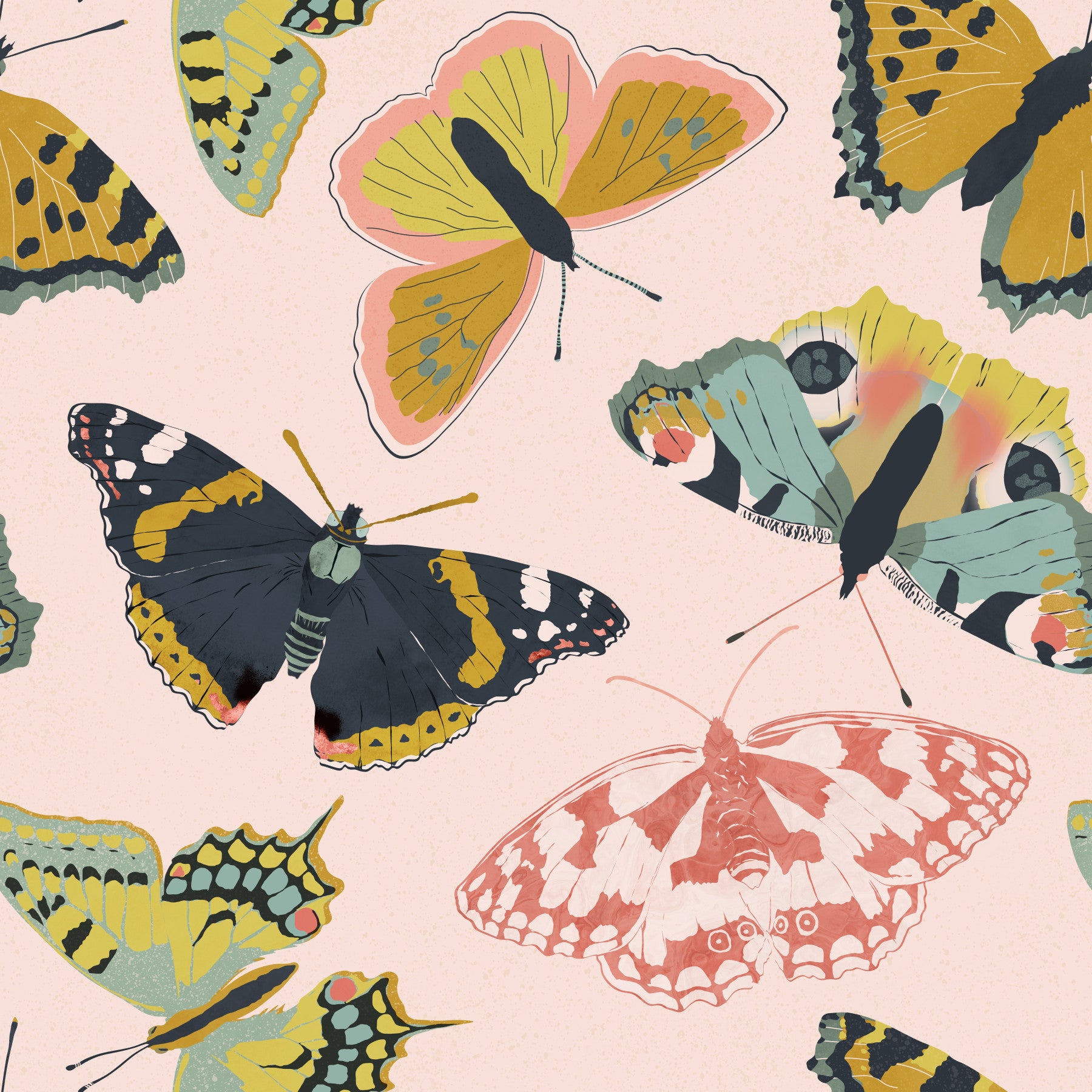 A gentle breeze seems to flutter through this wallpaper, showcasing a collection of artistically rendered butterflies in soft, harmonious colors. Blush pinks and muted greens combine with hints of gold to create a tranquil ambiance. Each butterfly is a unique piece of art, blending abstract forms with realistic details. The style is simultaneously playful and sophisticated, making this wallpaper suitable for various spaces from children's rooms to tranquil living areas. The seamless pattern ensures a cohesive and aesthetically pleasing design, no matter the scale.