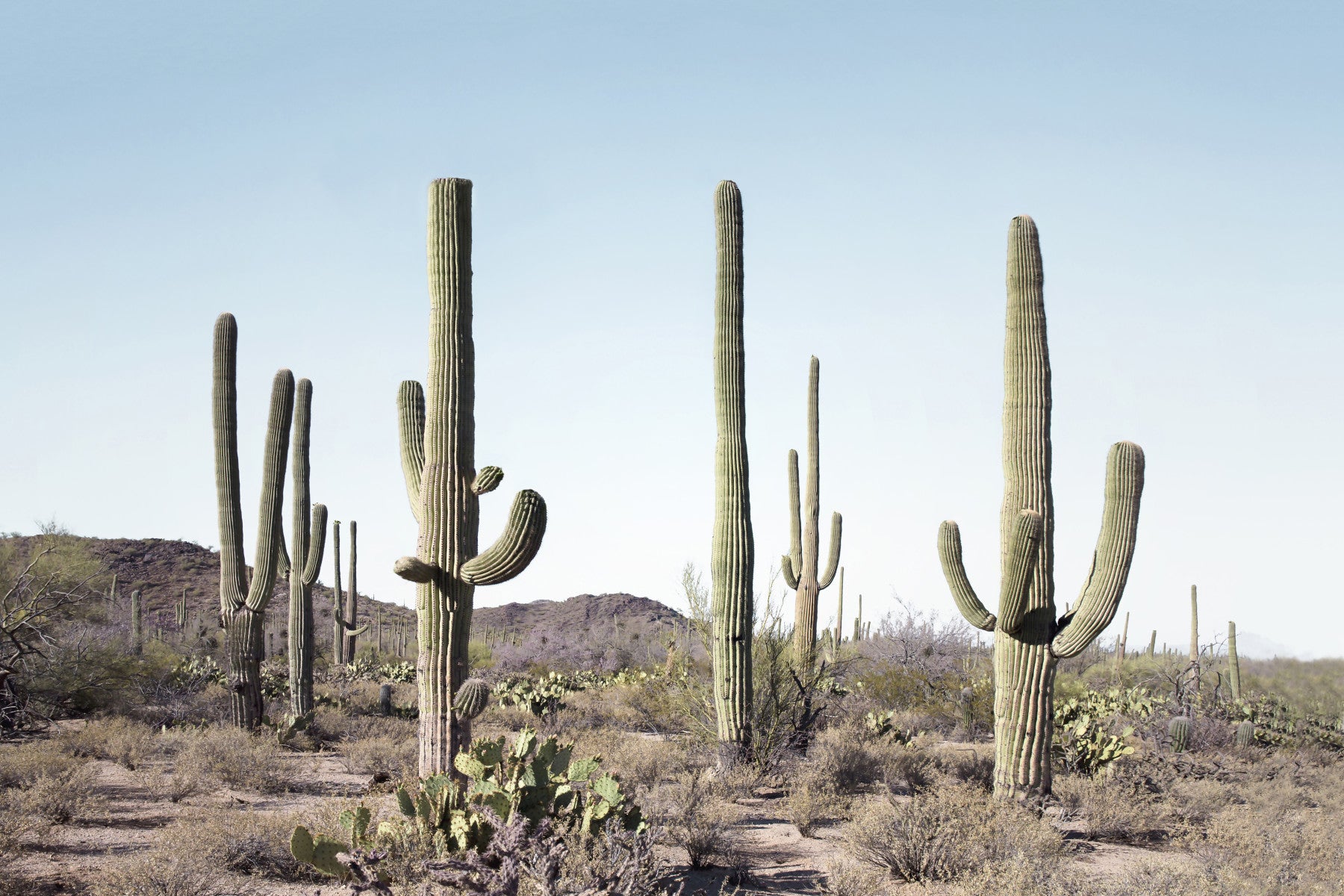 Escape to the serene beauty of 'Cactus Land,' where towering saguaro cacti dominate a sun-drenched desert landscape. This minimalist wallpaper captures the essence of the arid Southwest, showcasing the majestic silhouettes of these iconic plants against a pale, clear sky. The muted color palette and expansive view create a peaceful, almost meditative mood, perfect for those seeking a touch of Southwestern tranquility on their digital devices. Feel the quiet strength of nature in this captivating depiction of a cactus-filled paradise. The subtle textures of the cacti and the surrounding desert flora add depth and visual interest, inviting the eye to wander across the scene.