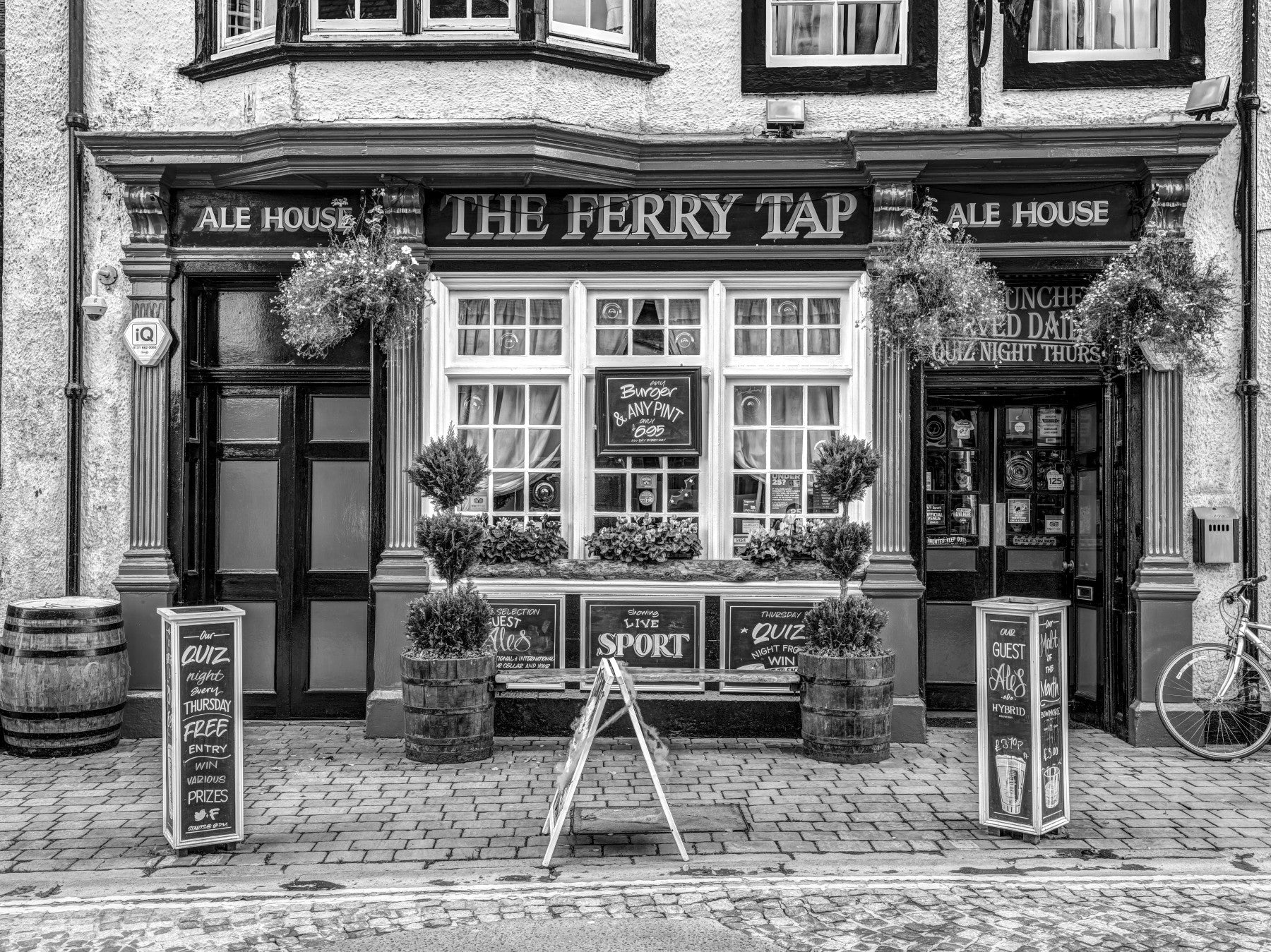 A peaceful wall mural of a cafe or pub storefront in South Queensferry.