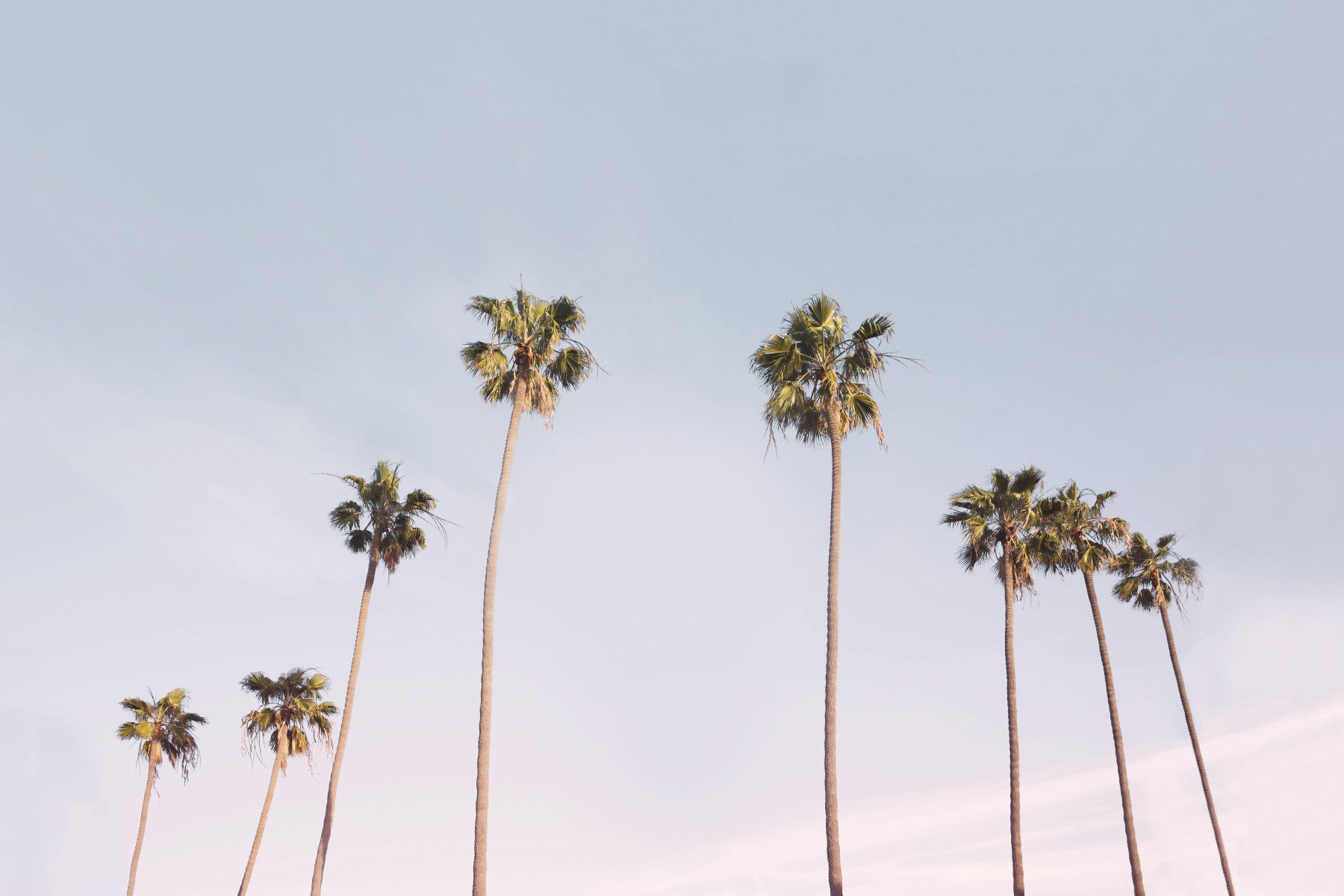 Capture the essence of California's laid-back lifestyle with this stunning wallpaper. The image features a row of majestic palm trees silhouetted against a pale, dreamy sky. The soft, slightly desaturated colors create a nostalgic and romantic feel, reminiscent of classic California postcards. The tall, slender trees reaching towards the heavens suggest ambition and tranquility, a perfect balance for a modern yet calming aesthetic. Ideal for adding a touch of West Coast charm to any room in your home, this wallpaper brings a sense of relaxed sophistication and effortless style.