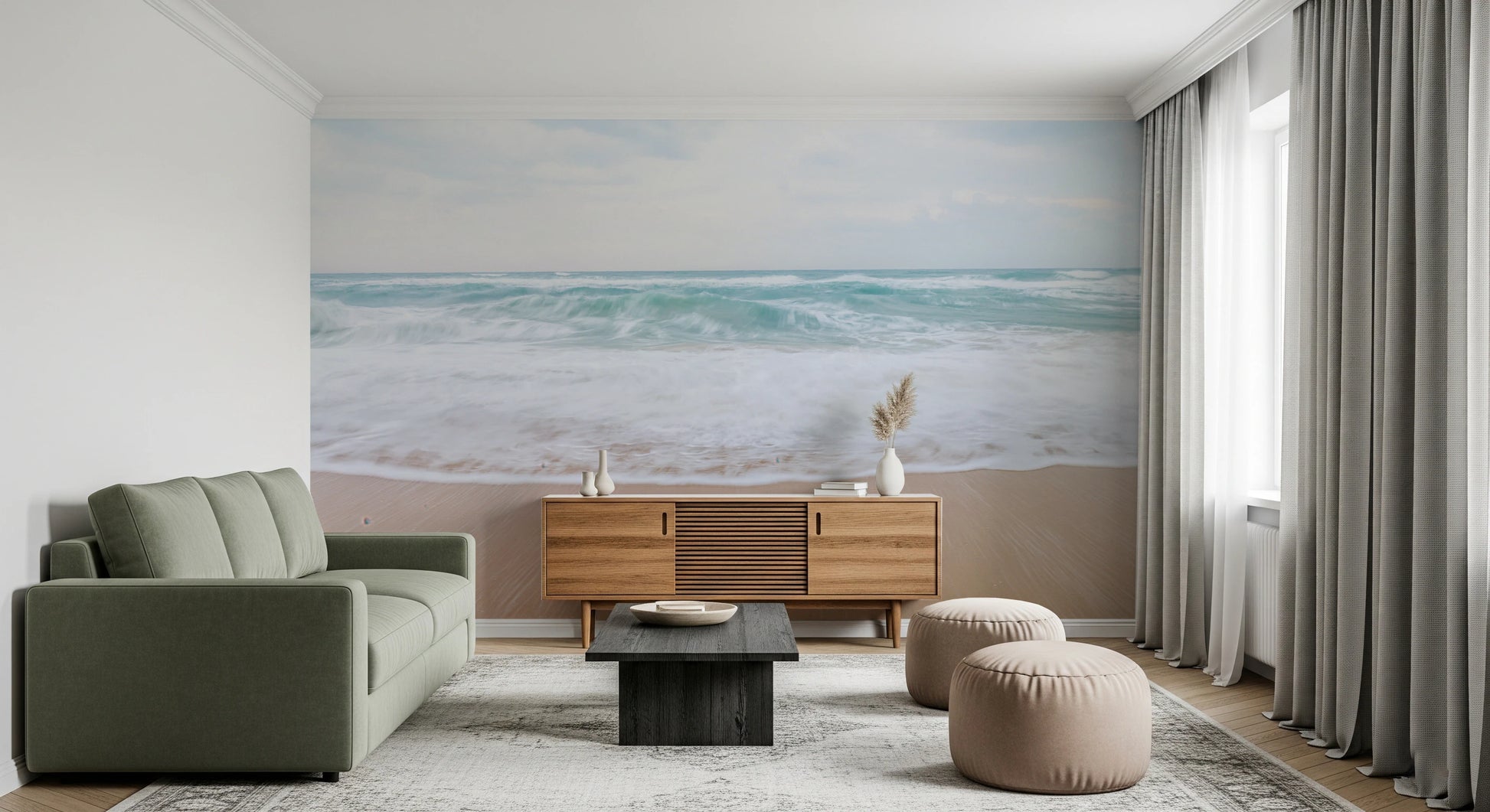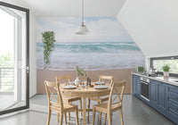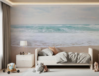 Invite the tranquility of the ocean into your home with this serene seascape wallpaper for walls. The design features the soft, muted tones of a sandy beach meeting gentle waves, creating a soothing and airy ambiance. The blurred motion of the water evokes a sense of calm, making it perfect for bedrooms, bathrooms, or any space where relaxation is key. This design works wonderfully to enhance natural light and complements minimalist or coastal-themed interiors. Embrace a peaceful atmosphere with this calming coastal scene.