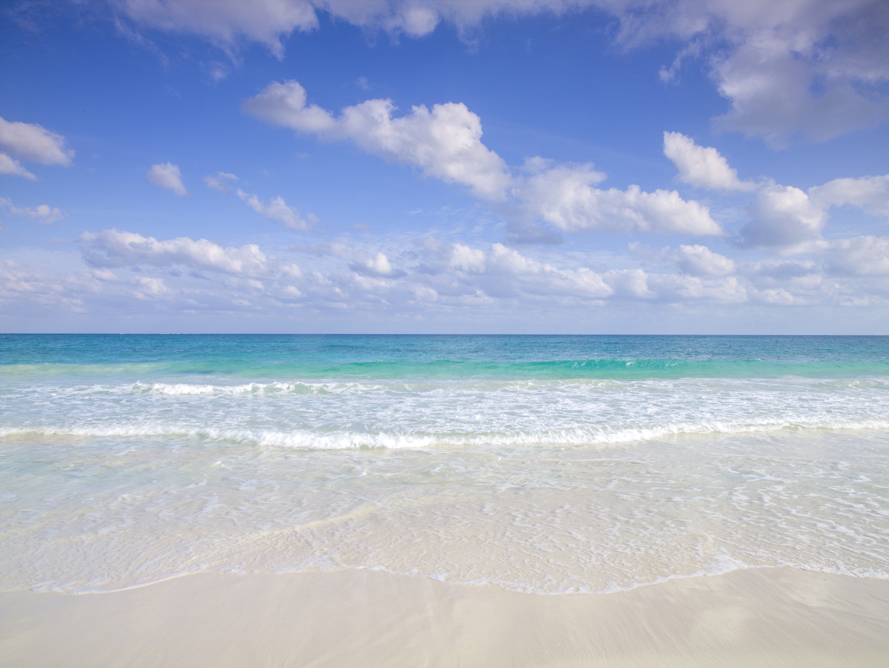 Cancun beach, Mexico. Invite the beauty of a tropical paradise into your home with this serene wallpaper for walls. Imagine soft, white waves meeting a pristine sandy shore beneath a bright blue sky dotted with gentle clouds. This design evokes a sense of calm and relaxation, making it a wonderful addition to bedrooms, bathrooms, or sunrooms. This paper's color palette adds a touch of elegance to various interiors, offering an airy, spacious impression.