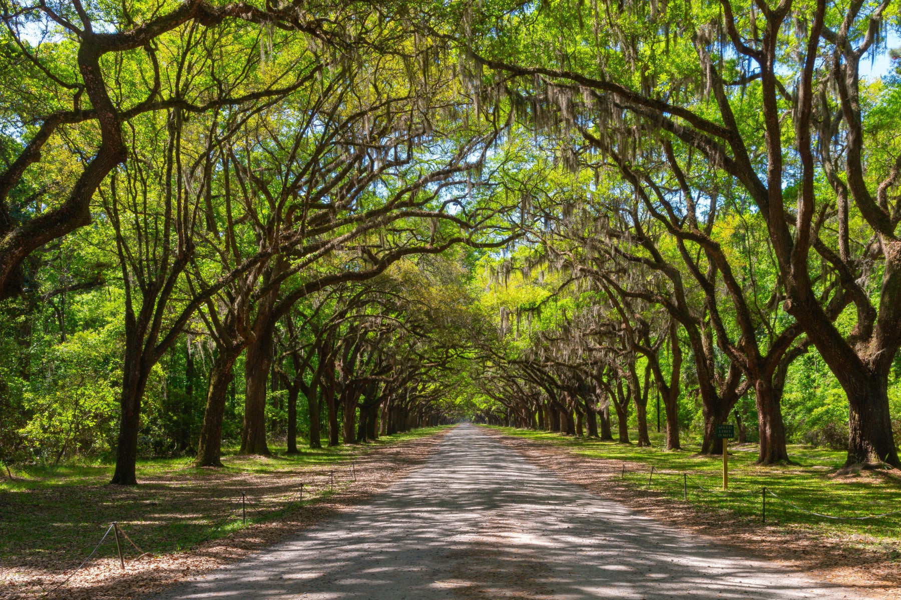 Envelop your space with the grandeur of nature. This stunning wallpaper for walls features a majestic avenue of live oak trees, their branches intertwining to form a verdant canopy. Sunlight filters through the leaves, creating an enchanting play of light and shadow. The muted greens and browns evoke a sense of tranquility, perfect for a living room, bedroom, or office space. Let this breathtaking vista bring the serenity of the outdoors into your everyday life and enhance your interior with a touch of natural elegance.