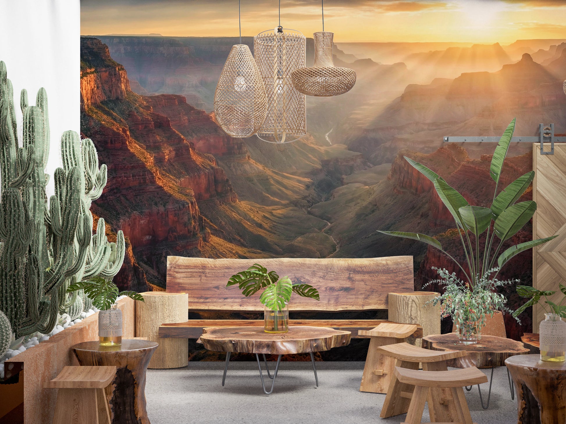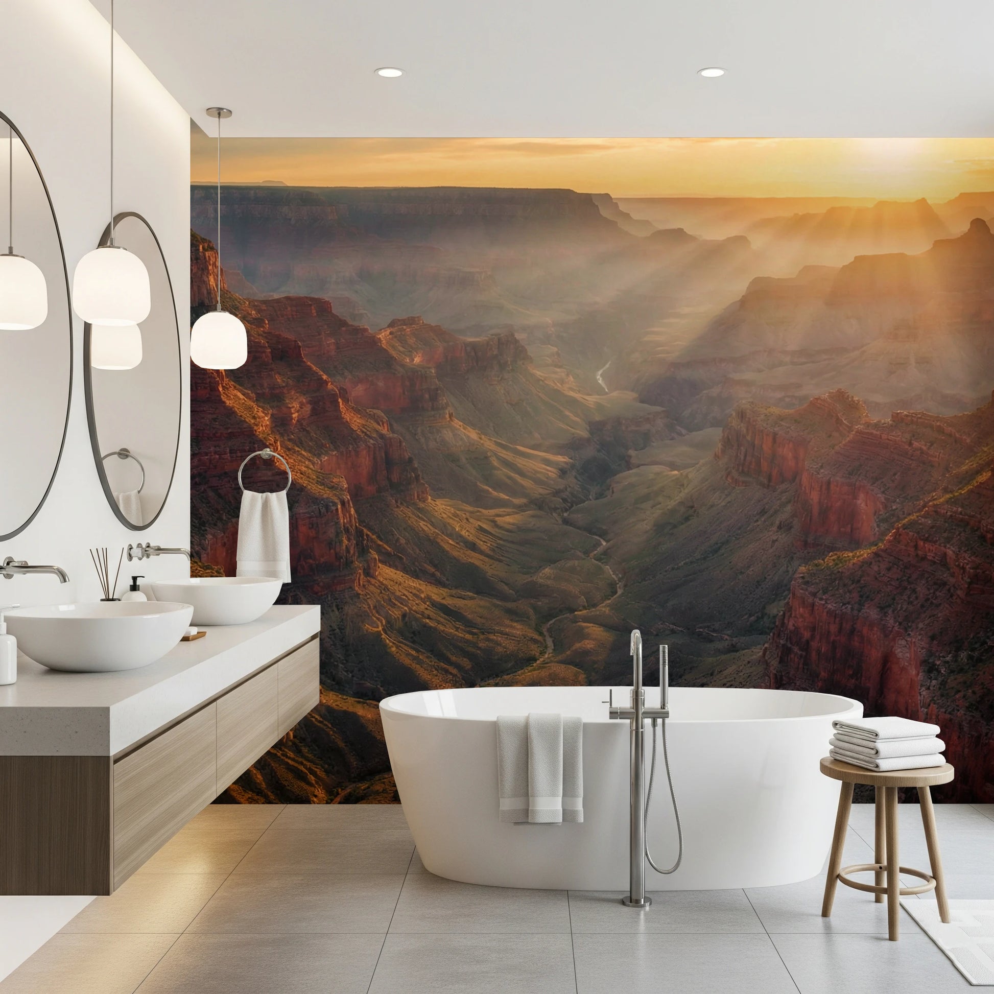 Transform your living space with this breathtaking canyon vista. The expansive view brings the grandeur of nature indoors, creating a sense of depth and openness. Warm tones of red, orange, and beige blend seamlessly, invoking feelings of peace and wonder. This wallpaper for walls works exceptionally well in living rooms, home offices, or bedrooms. The landscape complements rustic, modern, or bohemian décor styles. It also adds a touch of adventure and serenity to any room, making your interior space feel both grounded and expansive.