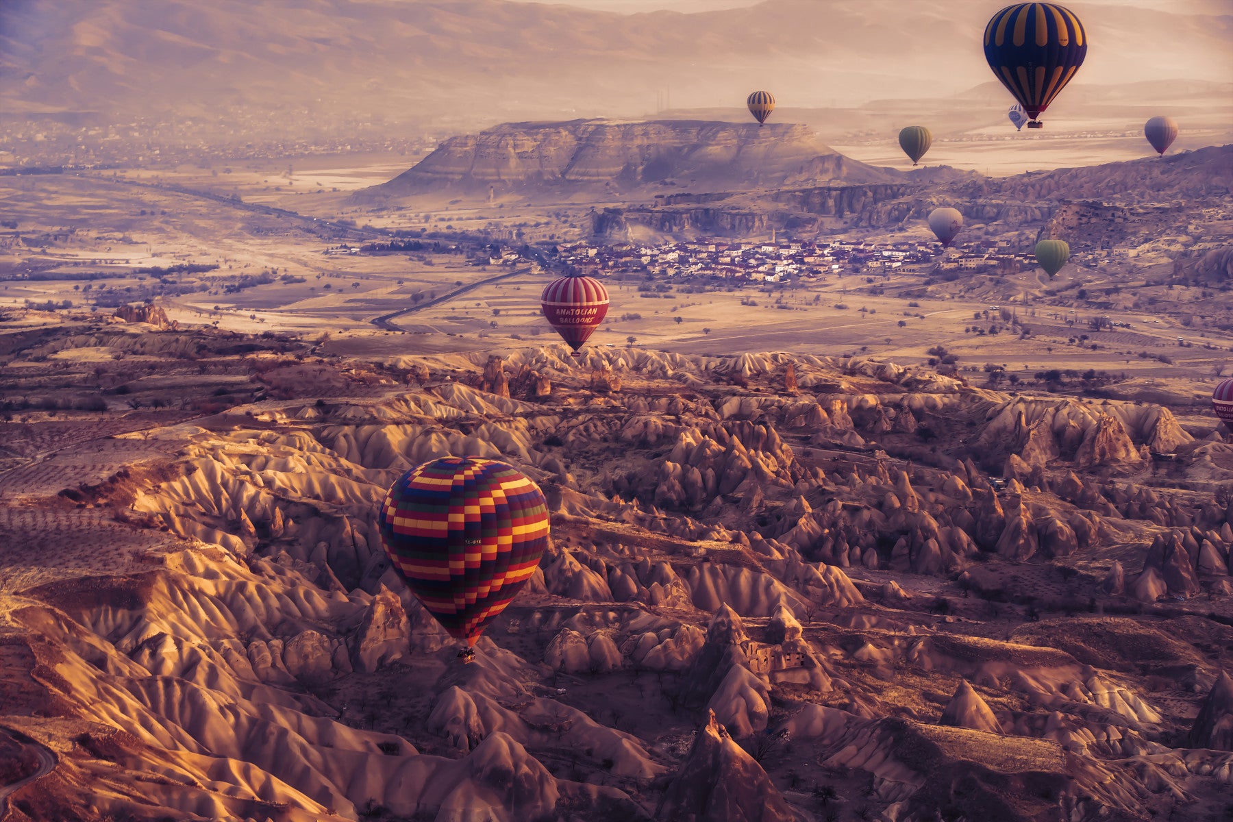 Drift away to a world of wonder with Cappadocia Dreams a breathtaking wallpaper that captures the ethereal beauty of Cappadocia's iconic hot air balloon spectacle. Witness a tapestry of vibrant balloons gracefully ascending over the surreal landscape, their colorful patterns contrasting against the soft, hazy sunrise. The unique rock formations, sculpted by centuries of wind and water, create a dreamlike panorama, stretching towards the horizon where a charming village nestles amidst the fairy chimneys. This image evokes a sense of tranquility and adventure, inviting you to escape the ordinary and embrace the magic of this otherworldly destination. Let "Cappadocia Dreams" transform your screen into a window to a land of enchantment, inspiring wanderlust and a sense of limitless possibility with every glance.
