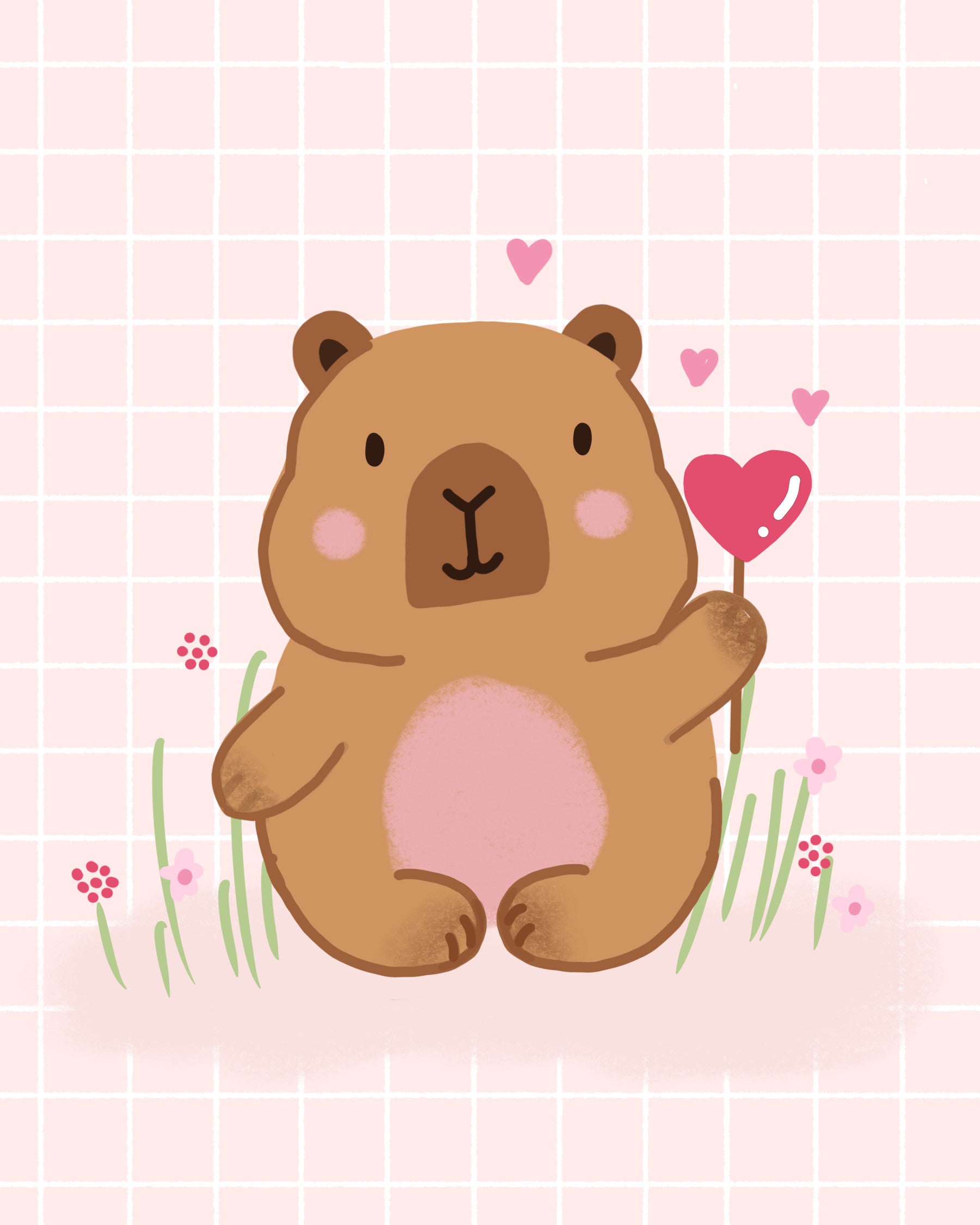 Immerse your child's space in sweetness with this charming custom-size wall mural featuring a lovable capybara. The adorable rodent, holding a single heart wand, is surrounded by hearts and tiny pink flowers. Its cartoon-style design stands out beautifully against a delicate pink grid pattern background. The color palette is composed of soft pinks, browns, and corals, evoking a warm and happy mood. Every detail, from the capybara's rosy cheeks to the small flowers, is rendered with care for a high-quality finish. This mural creates a cheerful and playful environment, making it a perfect backdrop for imagination and dream-filled days. It brings the perfect touch of innocent wonder to any flat vertical surface, ensuring the space feels both inviting and joyful.