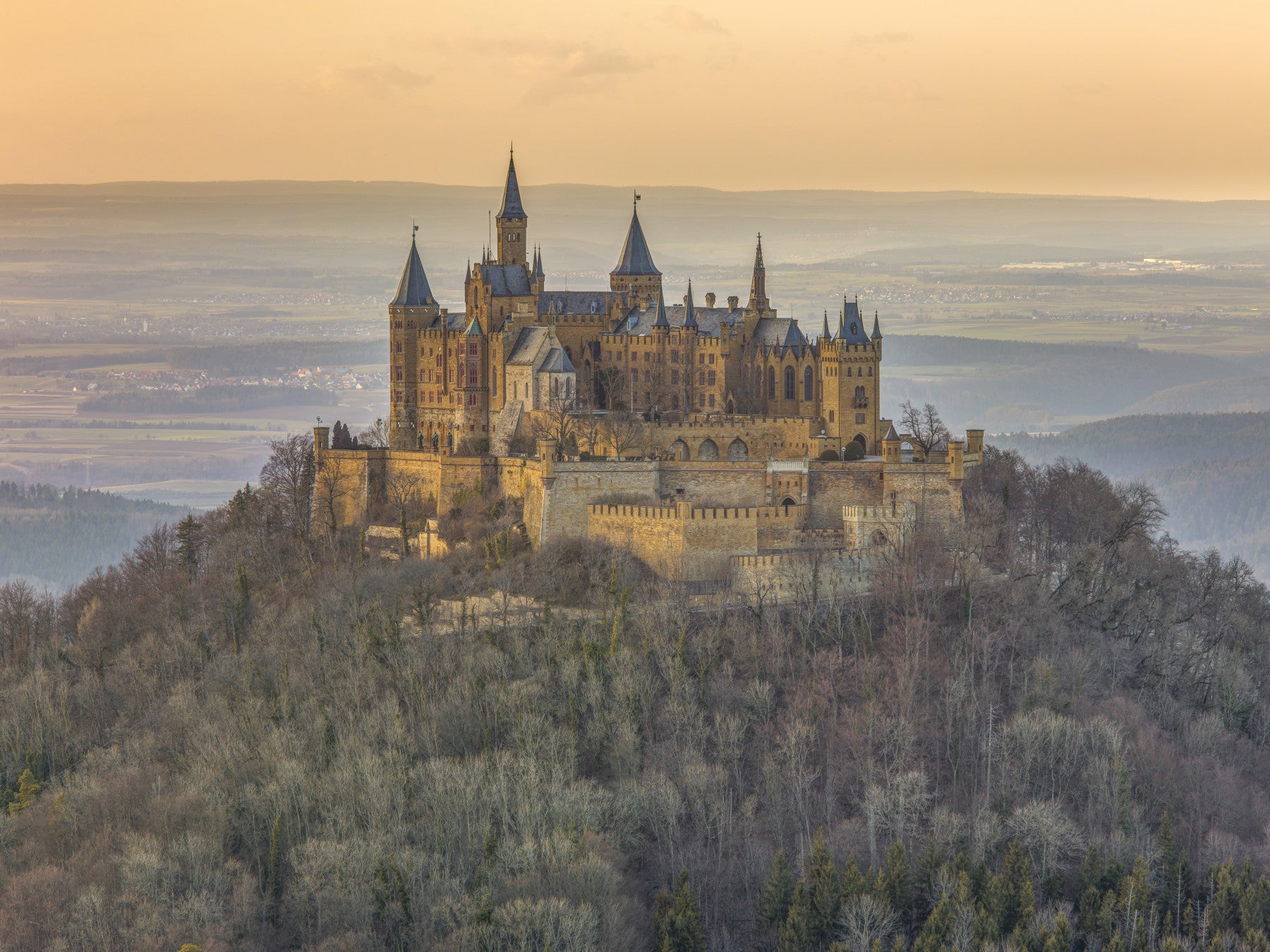 Elevate the atmosphere in any room with this striking wallpaper for walls. It depicts a grand castle perched atop a forested hill, bathed in the soft glow of dawn. The earthy tones of the stone architecture contrast beautifully with the gentle peach and amber sky, bringing a warm, inviting ambiance to living rooms, dining spaces, or studies. The detailed design adds depth and a sense of history to interiors, creating a focal point that sparks imagination. Use this wallpaper to transform your home into a regal retreat.