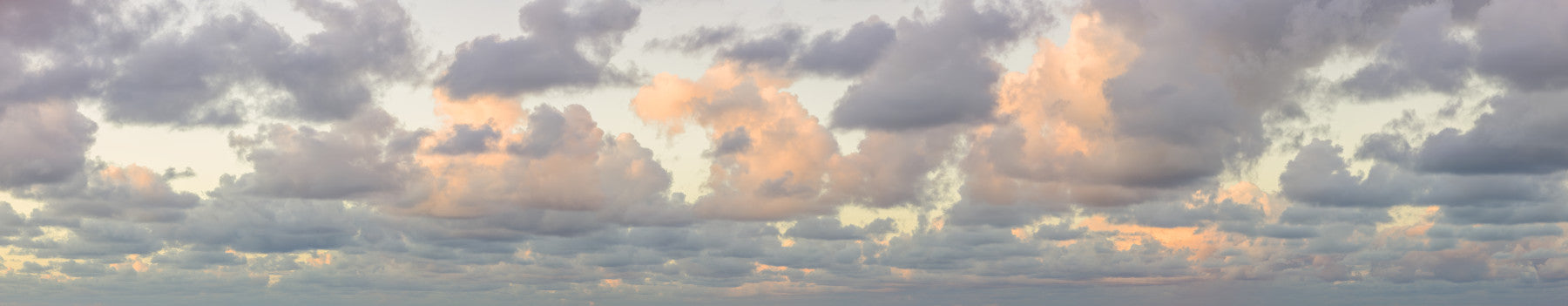 A breathtaking panorama of a sky filled with fluffy cumulus clouds, bathed in the soft, pastel hues of sunrise or sunset. The clouds are densely packed, creating a textured, almost painterly effect. Shades of grey, blush pink, and peach blend seamlessly, evoking a feeling of tranquility and serenity. This wallpaper is perfect for creating a calming and dreamy atmosphere in any room, bringing a touch of the outdoors in.
