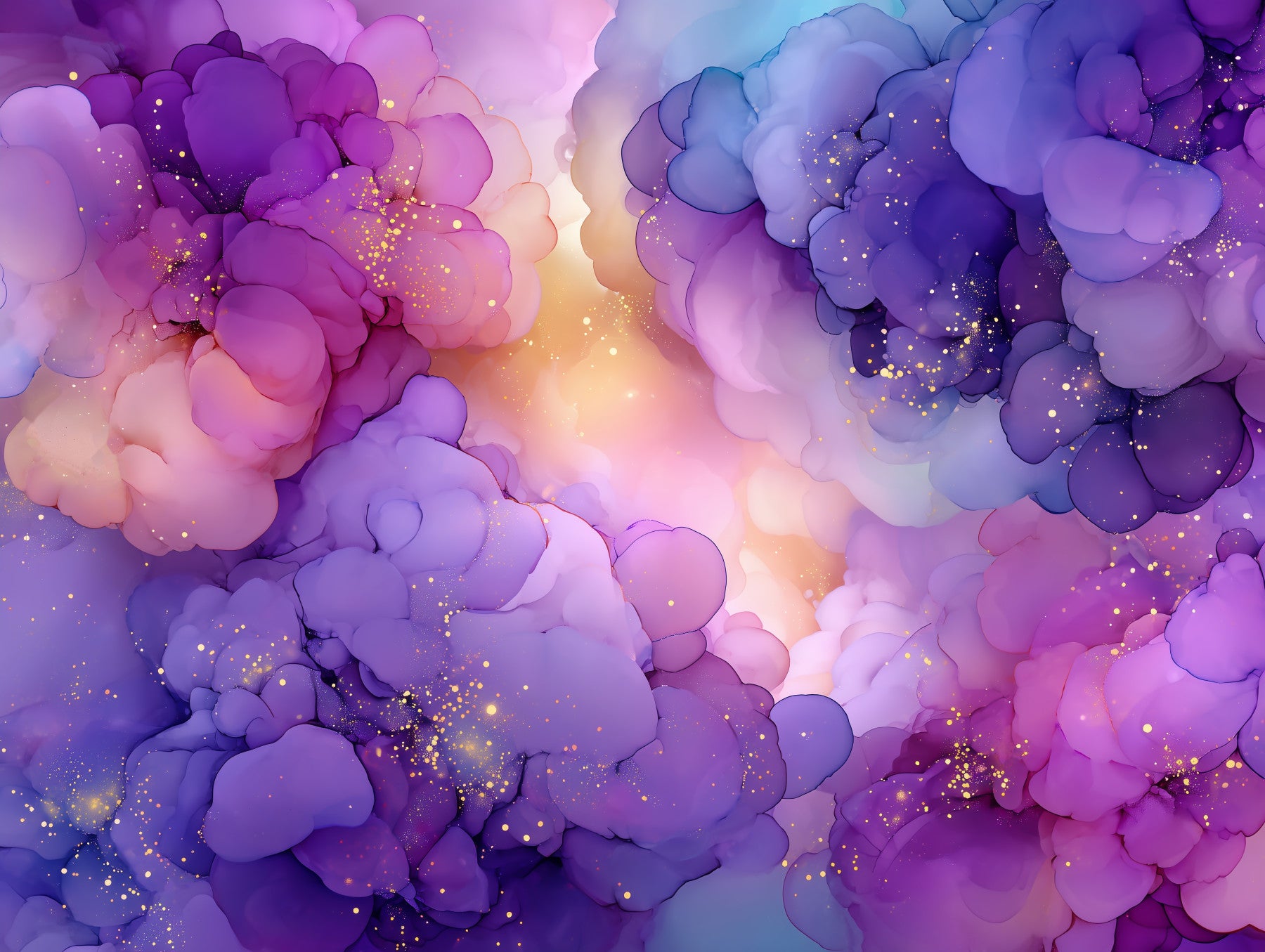 Bring an artistic touch to your walls with this abstract floral design. Blending techniques inspired by watercolor and alcohol ink, the image features clusters in shades of purple, pink, and blue, all accented with shining gold. The result is a calming, dreamlike effect. This wallpaper for walls enhances interiors, making it perfect for bedrooms, living rooms, or meditation spaces. Experience how these colorful and luxurious details transforms any space.