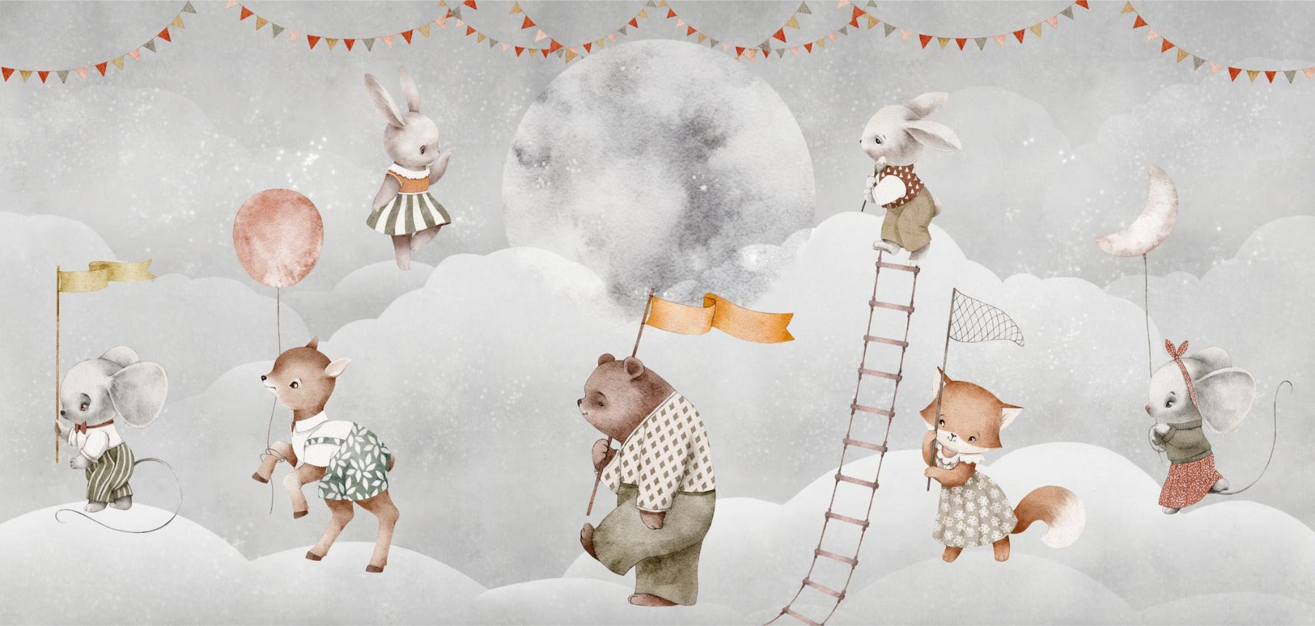 Welcome to a forest festival above, where magic becomes part of the night. Our animal wallpaper envelops adorable creatures that grab hold of stories of bravery, camaraderie, and exploration rippling across the silvery moonlight streams. Unmistakably present are a steadfast bear waving a flag of triumph, rabbits adrift with serene moonlight, and a grounded fox fishing among the stars. Each monster in this celestial congregation appears to whisper secrets of the wild and beckons your little ones to listen and spin their epics around. This mural with a celestial nursery adventure can be the crown jewel of your child's nursery or playroom, as you imagine it as the habitat for thousands of adventures.