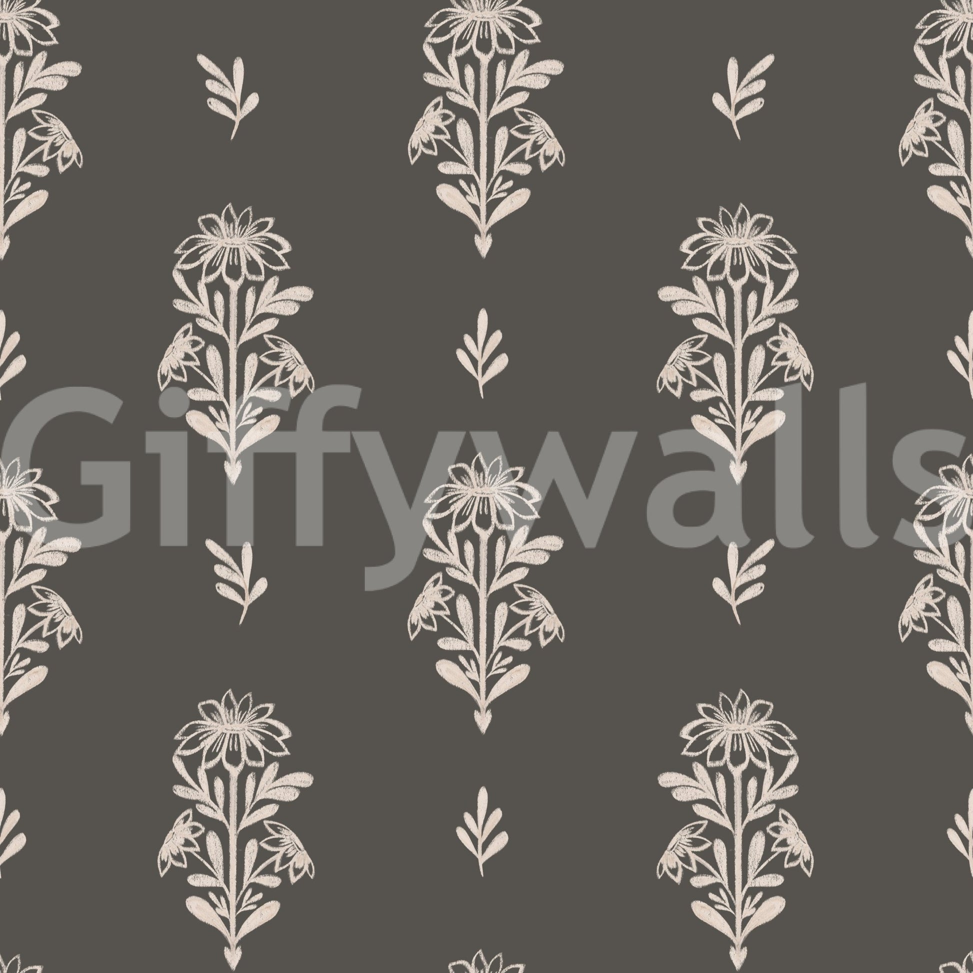 This wallpaper showcases a delicate and understated floral design, rendered in soft, chalky off-white hues against a sophisticated charcoal grey background. The hand-drawn style of the floral motifs evokes a sense of handcrafted charm and simple elegance. The repeating pattern is subtle yet captivating, creating a calming and sophisticated atmosphere. Perfect for bedrooms, living rooms, or any space where a touch of understated elegance is desired. The muted color palette and simple design make it a versatile choice that complements various interior styles, from minimalist to modern farmhouse.
