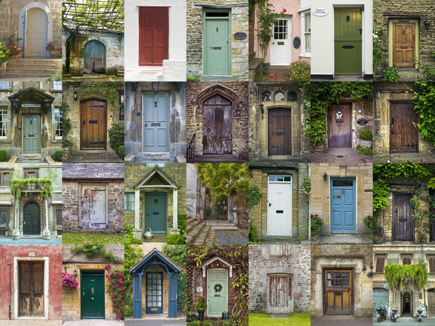 Collage of old doors, Cotswold, UK. Welcome guests with a collection of inviting doorways! This collage presents a variety of architectural styles, door colors, and textured stone walls. Greenery, floral accents, and unique knockers add personality to each entryway. This wallpaper for walls lends a touch of European charm to hallways, entryways, or any space needing warmth. Transform a study into a library or brighten a mudroom with this detailed scene. The diverse textures and colors ensure it complements both rustic and modern interiors.