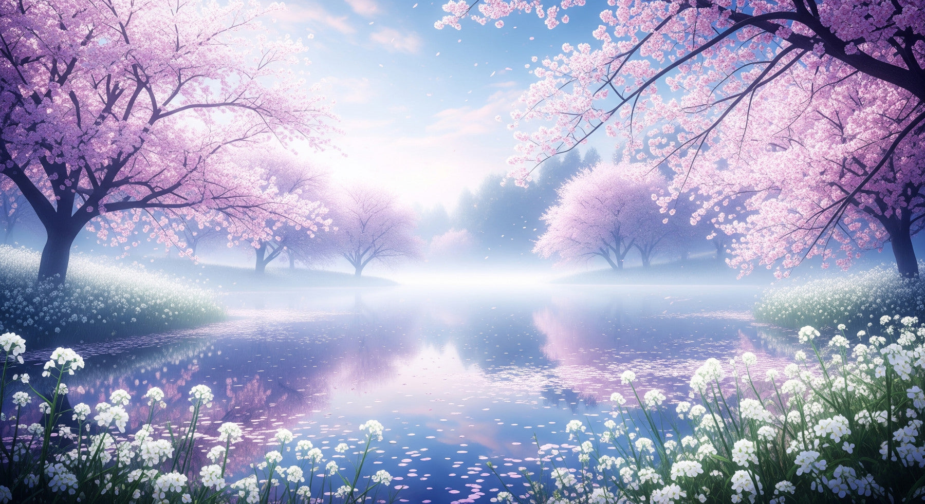 This wallpaper features a tranquil landscape bathed in soft light. Pink cherry blossoms frame a still lake, creating a peaceful ambiance. The scene blends pastel shades of pink, blue, and white for a dreamy look. Perfect wallpaper for walls in bedrooms, living rooms, or any space where calm is desired. Its serene design enhances interiors, creating a relaxing retreat.