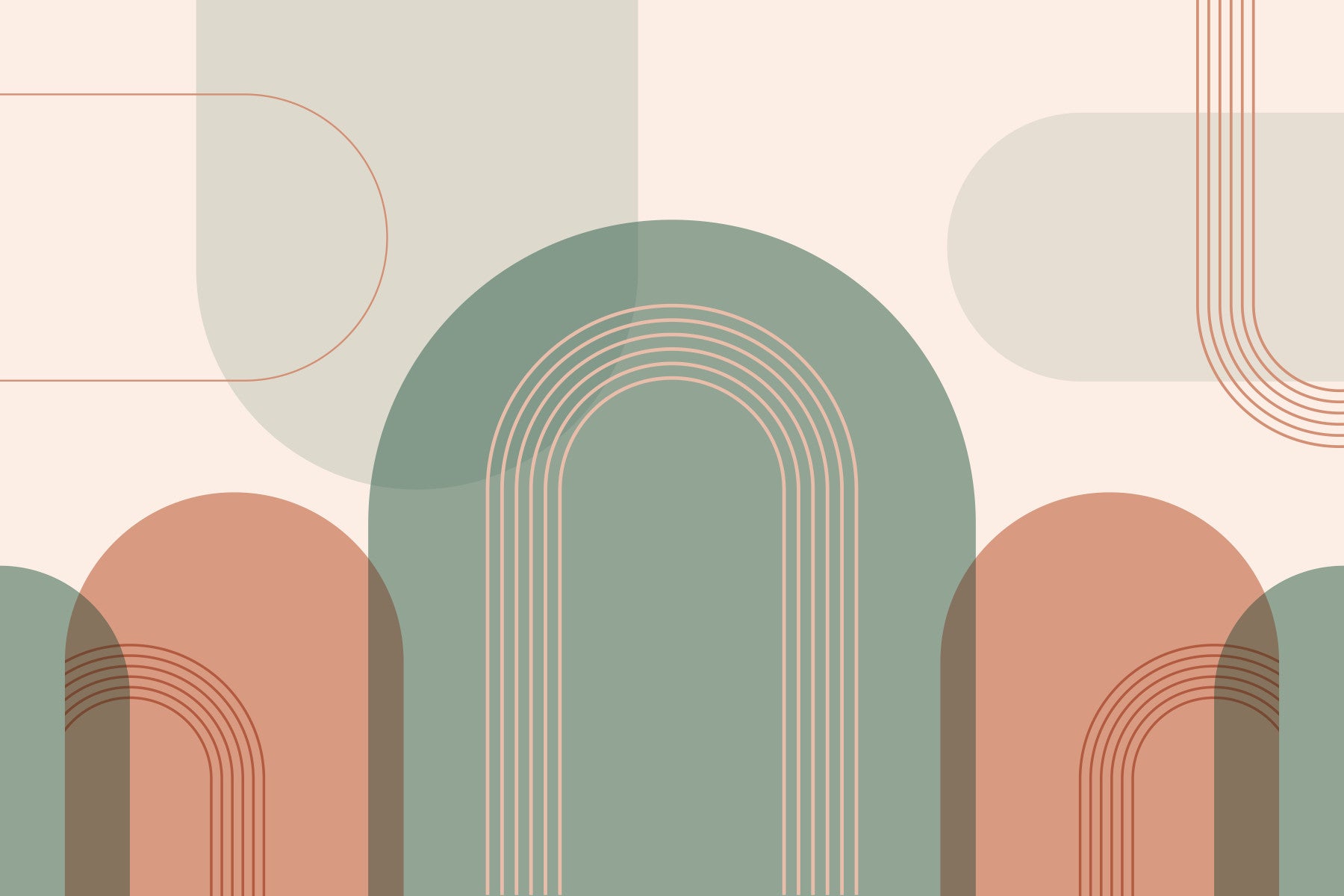 Indulge in the serene beauty of Chic Arched Elegance. This minimalist wallpaper showcases a captivating interplay of soft sage green and muted terracotta arches, layered with delicate blush-toned lines. The organic shapes and subtle color palette create a calming and sophisticated atmosphere, perfect for modern and minimalist interiors. The overlapping arches suggest a sense of depth and tranquility, while the clean lines maintain a sense of understated elegance. This wallpaper is a perfect blend of contemporary design and timeless appeal, bringing a touch of refined sophistication to any digital space.
