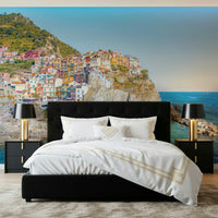 Bring the allure of Cinque Terre to your home with this vibrant wallpaper for walls. The image shows a historic village sitting on the rugged coastline. Its architecture combines with the clear blue waters of the Mediterranean Sea. This design breathes life into any space. The use of light colors and the bright sky create a serene atmosphere. Ideal for a bedroom, living area, or home office, it gives a touch of coastal charm and a relaxing atmosphere to your interiors.